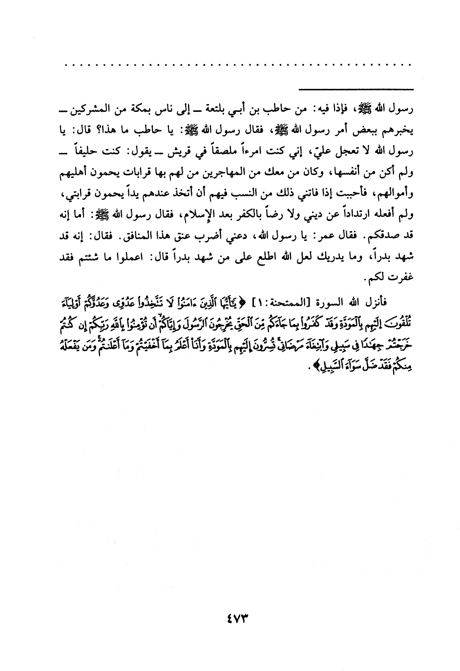 فأنزل الله السورة [الممتحنة: 1] {يَا أَيُّهَا الَّذِينَ آمَنُوا لَا تَتَّخِذُوا عَدُوِّي وَعَدُوَّكُمْ أَوْلِيَاءَ تُلْقُونَ إِلَيْهِمْ بِالْمَوَدَّةِ وَقَدْ كَفَرُوا بِمَا جَاءَكُمْ مِنَ الْحَقِّ يُخْرِجُونَ الرَّسُولَ وَإِيَّاكُمْ أَنْ تُؤْمِنُوا بِاللَّهِ رَبِّكُمْ إِنْ كُنْتُمْ خَرَجْتُمْ جِهَادًا فِي سَبِيلِي وَابْتِغَاءَ مَرْضَاتِي تُسِرُّونَ إِلَيْهِمْ بِالْمَوَدَّةِ وَأَنَا أَعْلَمُ بِمَا أَخْفَيْتُمْ وَمَا أَعْلَنْتُمْ وَمَنْ يَفْعَلْهُ مِنْكُمْ فَقَدْ ضَلَّ سَوَاءَ السَّبِيلِ (1)}.