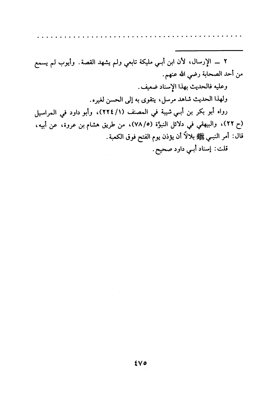 رواه أبو بكر بن أبي شيبة في المصنف (1/ 224)، وأبو داود في المراسيل (ح22)، والبيهقي في دلائل النبوَّة (78/ 5)، من طريق هشام بن عروة، عن أبيه، قال: أمر النبي -صلى الله عليه وسلم- بلالًا أن يؤذن يوم الفتح فوق الكعبة.