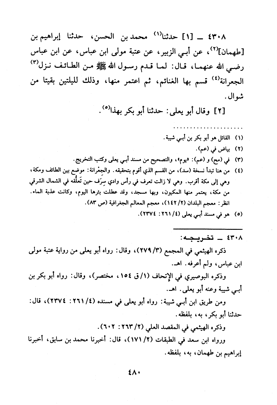 4308 -[1] حَدَّثَنَا مُحَمَّدُ بْنُ الْحَسَنِ، حدثنا إِبْرَاهِيمُ بْنُ [طَهْمَانَ] ، عَنْ أَبِي الزُّبَيْرِ، عَنْ عُتْبَةَ مَوْلَى ابْنِ عَبَّاسٍ، عَنِ ابن عباس رَضِيَ الله عَنْهما، قَالَ: §لَمَّا قَدِمَ رَسُولُ اللَّهِ صَلَّى اللَّهُ عَلَيْهِ وَسَلَّمَ من الطائف نزل الْجِعْرَانَةِ قَسَمَ بِهَا الْغَنَائِمَ، ثُمَّ اعْتَمَرَ مِنْهَا، وَذَلِكَ لِلَيْلَتَيْنِ بَقِيَتَا مِنْ شَوَّالٍ.