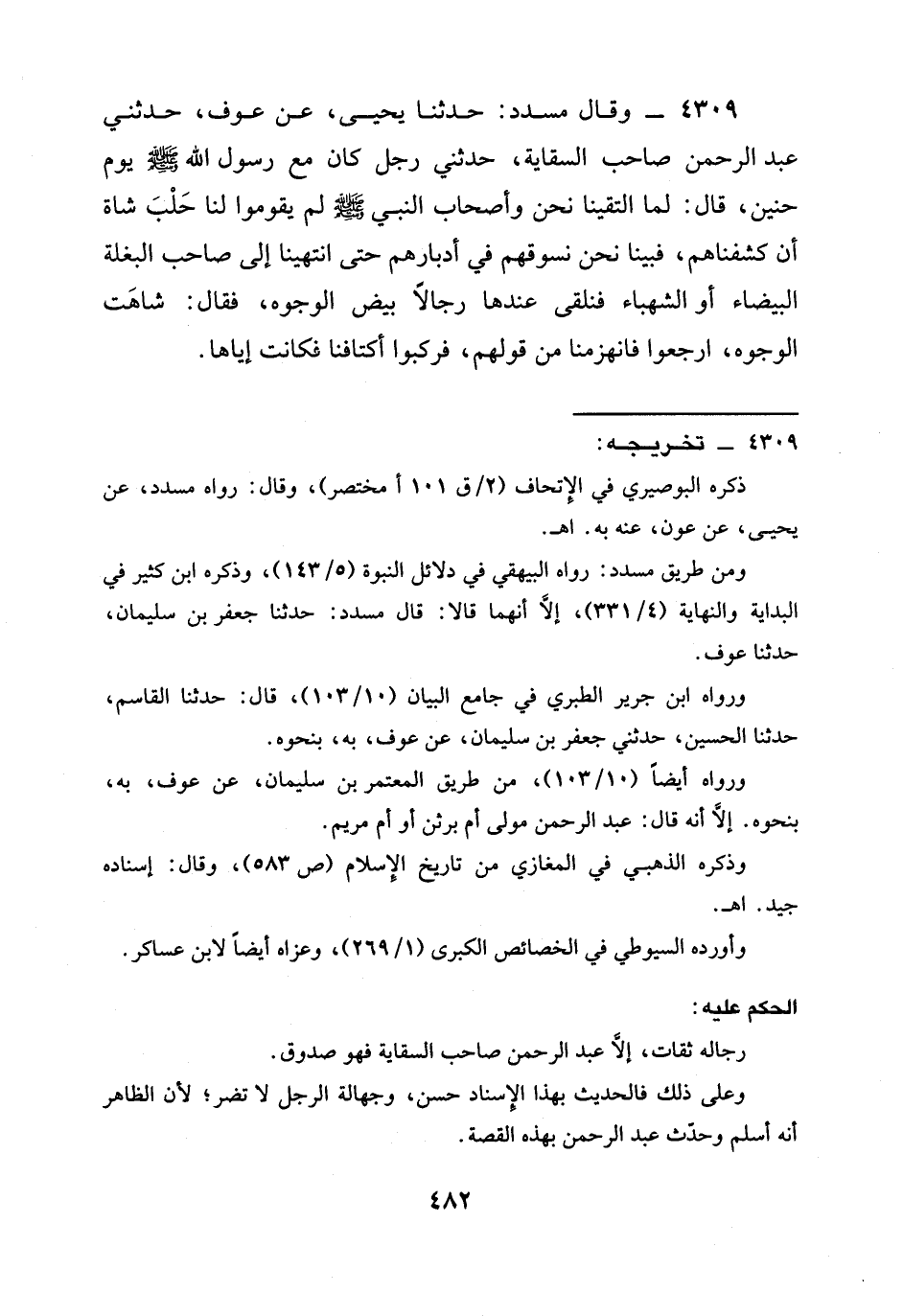 4309 - وَقَالَ مُسَدَّدٌ: حدثنا يَحْيَى، عَنْ عَوْفٍ، حَدَّثَنِي عَبْدُ الرَّحْمَنِ صَاحِبُ السِّقَايَةِ، حَدَّثَنِي رَجُلٌ كَانَ مَعَ رَسُولِ اللَّهِ صَلَّى اللَّهُ عَلَيْهِ وَسَلَّمَ يَوْمَ حُنَيْنٍ، قَالَ: لَمَّا الْتَقَيْنَا نَحْنُ وَأَصْحَابُ النَّبِيِّ صَلَّى اللَّهُ عَلَيْهِ وَسَلَّمَ لَمْ يَقُومُوا لَنَا حَلْبَ شَاةٍ أَنْ كشفناهم، فبينا نحن نَسُوقُهُمْ فِي أَدْبَارِهِمْ حَتَّى انْتَهَيْنَا إِلَى صَاحِبِ الْبَغْلَةِ الْبَيْضَاءِ أَوِ الشَّهْبَاءِ فَنَلْقَى عِنْدَهَا رِجَالًا بِيضَ الْوُجُوهِ، فَقَالَ: §شَاهَتِ الْوُجُوهُ، ارْجِعُوا فَانْهَزَمْنَا مِنْ قَوْلِهِمْ، فَرَكِبُوا أَكْتَافَنَا فكانت إِيَّاهَا.