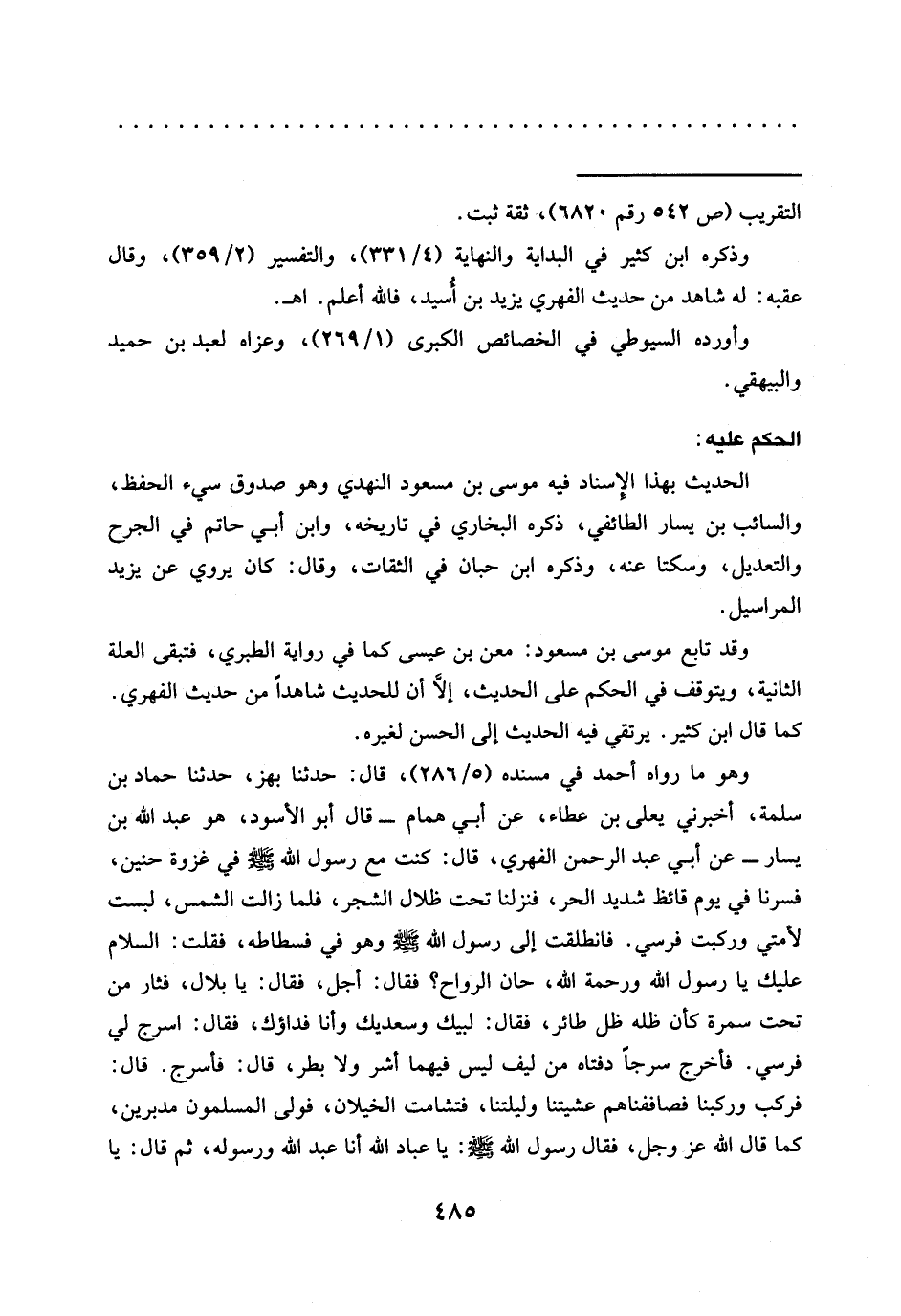 وهو ما رواه أحمد في مسنده (5/ 286)، قال: حدَّثنا بهز، حدَّثنا حماد بن سلمة، أخبرني يعلي بن عطاء، عن أبي همام -قال أبو الأسود، هو عبد الله بن يسار- عن أبي عبد الرحمن الفهري، قَالَ: كُنْتُ مَعَ رَسُولِ اللَّهِ -صَلَّى اللَّهُ عليه وسلم- في غزوة حنين، فسرنا في يوم قائظ شديد الحر، فنزلنا تحت ظلال الشجر، فلما زالت الشمس، لبست لأمتي وركبت فرسي. فانطلقت إلى رسول الله -صلى الله عليه وسلم- وهو في فسطاطه، فقلت: السلام عليك يا رسول الله ورحمة الله، حان الرواح؟ فقال: أجل، فقال: يا بلال، فثار من تحت سمرة كأن ظله ظل طائر، فقال: لبيك وسعديك وأنا فداؤك، فقال: اسرج لي فرسي. فأخرج سرجًا دفتاه من ليف ليس فيهما أشر ولا بطر، قال: فأسرج. قال: فركب وركبنا فصاففناهم عشيتنا وليلتنا، فتشامت الخيلان، فولى المسلمون مدبرين، كما قال الله عزَّ وجلَّ، فَقَالَ رَسُولُ اللَّهِ -صَلَّى اللَّهُ عَلَيْهِ وَسَلَّمَ-: يا عباد الله أنا عبد الله ورسوله، ثم قال: يا =