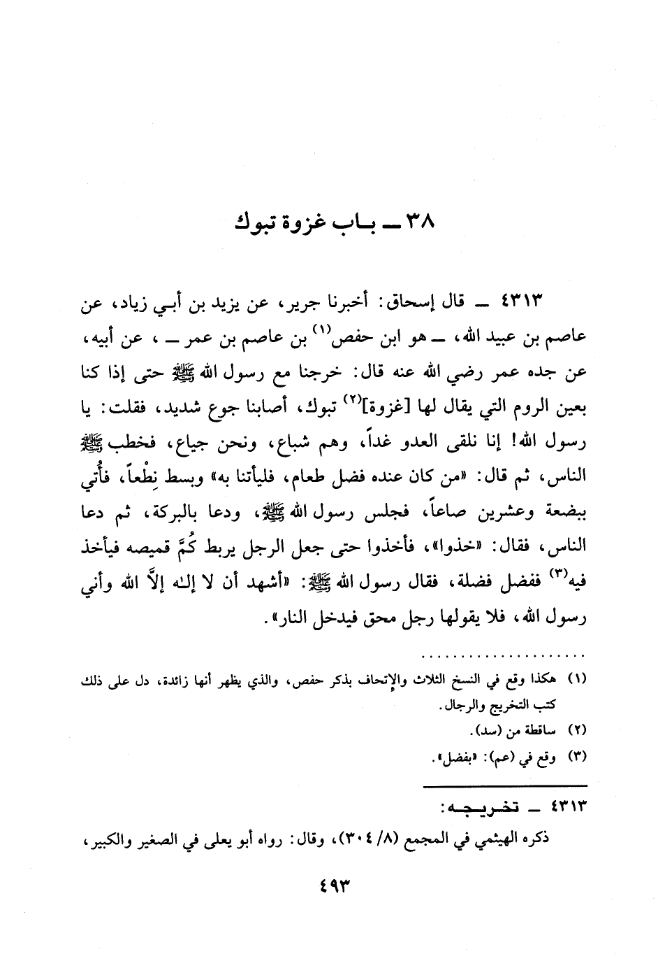 4313 - قَالَ إِسْحَاقُ: أخبرنا جَرِيرٌ، عَنْ يَزِيدَ بْنِ أَبِي زِيَادٍ، عَنْ عَاصِمِ بْنِ عُبَيْدِ اللَّهِ، - هُوَ ابْنُ حَفْصِ بْنِ عَاصِمِ بْنِ عُمَرَ -، عَنْ أَبِيهِ، عَنْ جَدِّهِ عُمَرَ رَضِيَ الله عَنْه قَالَ: خَرَجْنَا مَعَ رَسُولِ اللَّهِ صَلَّى اللَّهُ عَلَيْهِ وَسَلَّمَ حَتَّى إِذَا كُنَّا بِعَيْنِ الرُّومِ الَّتِي يُقَالُ لَهَا [غَزْوَةُ] تَبُوكَ، أَصَابَنَا جُوعٌ شَدِيدٌ، فَقُلْتُ: يَا رَسُولَ الله! إنا نلقى العدو غدا، وهم شِبَاعٌ، وَنَحْنُ جِيَاعٌ، فَخَطَبَ صَلَّى اللَّهُ عَلَيْهِ وَسَلَّمَ النَّاسَ، ثُمَّ قَالَ: " §مَنْ كَانَ عِنْدَهُ فَضْلُ طَعَامٍ، فَلْيَأْتِنَا بِهِ " وَبَسَطَ نِطَعًا، فَأُتِيَ بِبِضْعَةٍ وَعِشْرِينَ صَاعًا، فَجَلَسَ رَسُولُ اللَّهِ صَلَّى اللَّهُ عَلَيْهِ وَسَلَّمَ، وَدَعَا بِالْبَرَكَةِ، ثُمَّ دَعَا النَّاسُ، فَقَالَ: " خُذُوا "، فَأَخَذُوا حَتَّى جَعَلَ الرَّجُلُ يَرْبِطُ كُمَّ قَمِيصَهُ فَيَأْخُذُ فِيهِ فَفَضَلَ فَضْلَةٌ، فَقَالَ رَسُولُ اللَّهِ صَلَّى اللَّهُ عَلَيْهِ وَسَلَّمَ: " أَشْهَدُ أَنْ لَا إِلَهَ إِلَّا اللَّهُ وَأَنِّي رَسُولُ اللَّهِ، فَلَا يَقُولُهَا رَجُلٌ مُحِقٌّ فَيَدْخُلُ النَّارَ ".