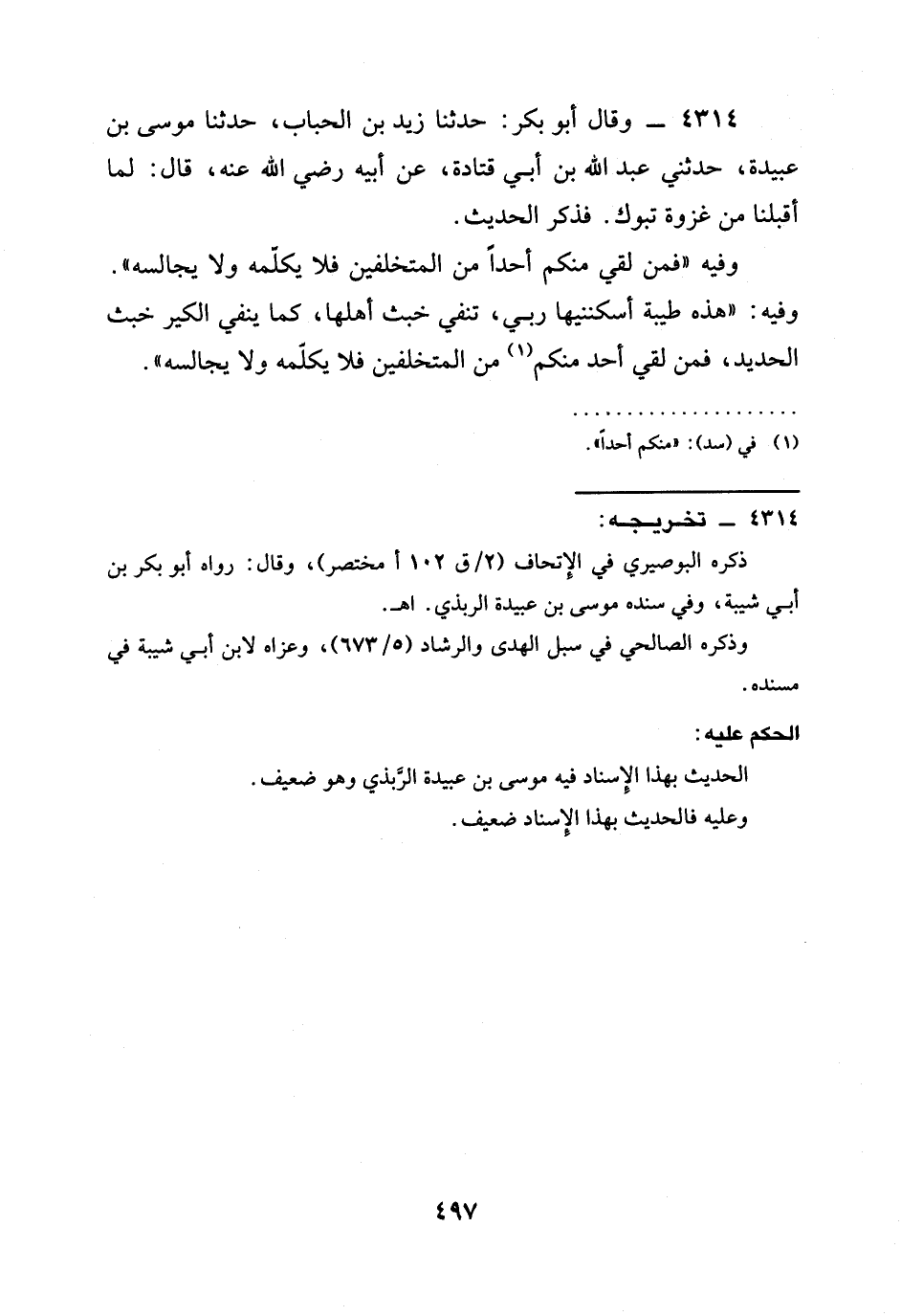 4314 - وَقَالَ أَبُو بَكْرٍ: حدَّثنا زَيْدُ بْنُ الحباب، حدَّثنا مُوسَى بْنُ عُبَيْدَةَ، حدَّثني عَبْدُ اللَّهِ بْنُ أبي قتادة، عن أبيه رضي الله عنه، قَالَ: لَمَّا أَقْبَلْنَا مِنْ غَزْوَةِ تَبُوكَ. فَذَكَرَ الْحَدِيثَ.