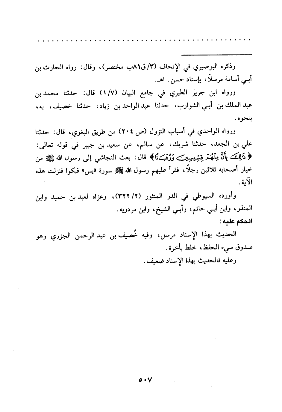 ورواه الواحدي في أسباب النزول (ص 204) من طريق البغوي، قال: حدَّثنا علي بن الجعد، حدَّثنا شَرِيكٌ، عَنْ سَالِمٍ، عَنْ سَعِيدِ بْنِ جُبَيْرٍ في قوله تعالى: {ذَلِكَ بِأَنَّ مِنْهُمْ قِسِّيسِينَ وَرُهْبَانًا} قَالَ: بَعَثَ النَّجَاشِيُّ إِلَى رَسُولِ اللَّهِ -صَلَّى الله عليه وسلم- من خيار أصحابه ثلاثين رجلًا، فَقَرَأَ عَلَيْهِمْ رَسُولُ اللَّهِ -صَلَّى اللَّهُ عَلَيْهِ وَسَلَّمَ- سورة "يس" فبكوا فنزلت هذه الآية.