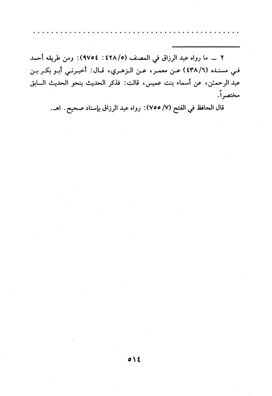 = 2 - ما رواه عبد الرزاق في المصنف (5/ 428: 9754): ومن طريقه أحمد في مسنده (6/ 438) عن معمر، عن الزهري، قال: أخبرني أبو بكر بن عبد الرحمن، عن أسماء بنت عميس، قالت: فذكر الحديث بنحو الحديث السابق مختصرًا.