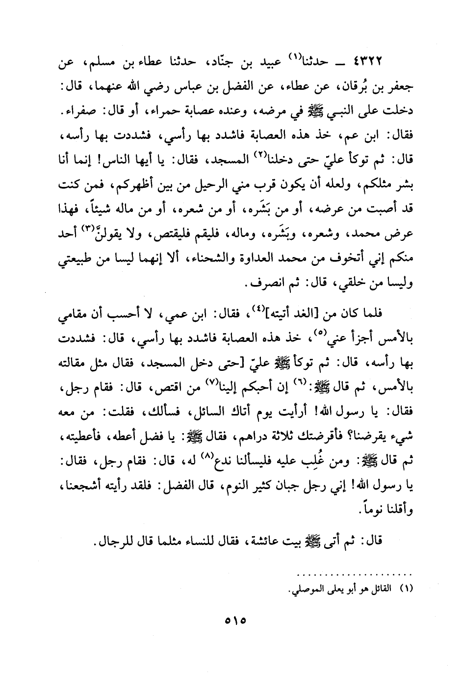 4322 - حدثنا عُبَيْدُ بْنُ جُنَادٍ، حدثنا عَطَاءُ بْنُ مُسْلِمٍ، عَنْ جَعْفَرِ بْنِ بُرْقَانَ، عَنْ عَطَاءٍ، عَنِ الْفَضْلِ بن عباس رَضِيَ الله عَنْهما، قَالَ: دَخَلْتُ عَلَى النَّبِيِّ صَلَّى اللَّهُ عَلَيْهِ وَسَلَّمَ فِي مَرَضِهِ، وَعِنْدَهُ عِصَابَةٌ حَمْرَاءُ، أَوْ قَالَ: صَفْرَاءُ. فَقَالَ: §ابْنَ عَمِّ، خُذْ هَذِهِ الْعِصَابَةَ فَاشْدُدْ بِهَا رَأْسِي، فَشَدَدْتُ بِهَا رَأْسَهُ، قَالَ: ثُمَّ تَوَكَّأَ عَلَيَّ حَتَّى دَخَلْنَا الْمَسْجِدَ، فَقَالَ: يَا أَيُّهَا النَّاسُ! إِنَّمَا أَنَا بَشَرٌ مِثْلُكُمْ، وَلَعَلَّهُ أَنْ يَكُونَ قَرَبَ مِنِّي الرَّحِيلُ مِنْ بَيْنَ أَظْهُرِكُمْ، فَمَنْ كُنْتُ قَدْ أَصَبْتُ مِنْ عِرْضِهِ، أَوْ مِنْ بَشَرِهِ، أَوْ مِنْ شَعْرِهِ، أَوْ مِنْ مَالِهِ شَيْئًا، فَهَذَا عِرْضُ مُحَمَّدٍ، وَشَعْرُهُ، وَبَشَرُهُ، وَمَالُهُ، فَلْيَقُمْ فَلْيَقْتَصَّ، وَلَا يَقُولَنَّ أَحَدٌ مِنْكُمْ إِنِّي أَتَخَوَّفُ مِنْ مُحَمَّدٍ الْعَدَاوَةَ وَالشَّحْنَاءَ، إِلَّا إِنَّهُمَا لَيْسَا مِنْ طَبِيعَتِي وَلَيْسَا مِنْ خُلُقِي، قَالَ: ثُمَّ انْصَرَفَ.