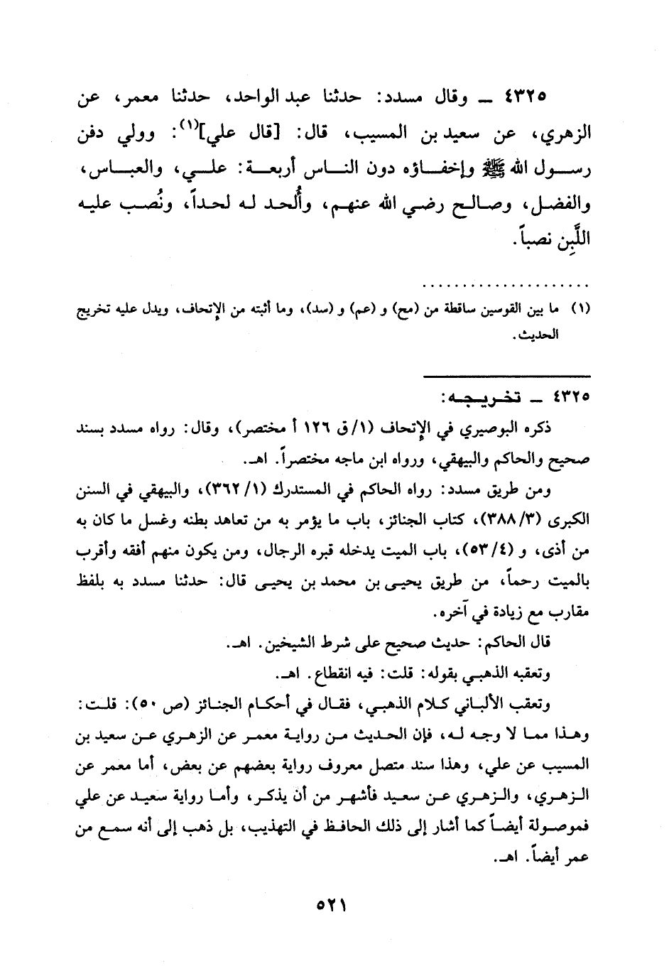 4325 - وَقَالَ مُسَدَّدٌ: حدثنا عَبْدُ الْوَاحِدِ، حدثنا مَعْمَرٌ، عَنِ الزُّهْرِيِّ، عَنْ سَعِيدِ بْنِ المسيب، قال: [قال علي] : §وَوَلِيَ دَفْنَ رَسُولِ اللَّهِ صَلَّى اللَّهُ عَلَيْهِ وَسَلَّمَ وإخفاؤه دُونَ النَّاسِ أَرْبَعَةٌ: عَلِيٌّ، وَالْعَبَّاسُ، والفضل، وصالح رَضِيَ الله عَنْهم، وَأَلْحَدَ لَهُ لَحْدًا، وَنَصَبَ عَلَيْهِ اللَّبِنَ نَصْبًا.