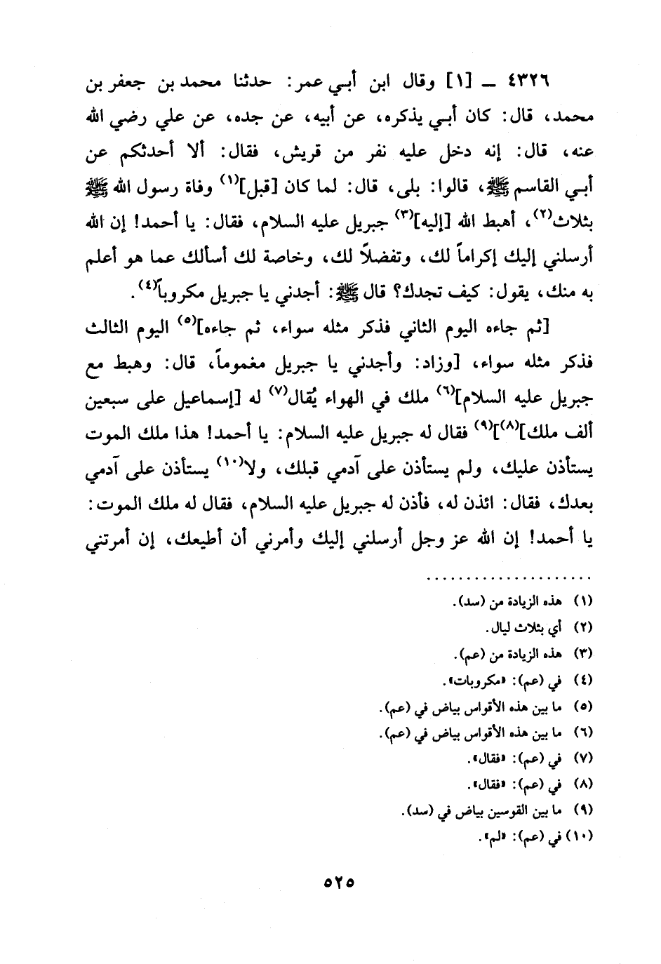 4326 -[2] رَوَاهُ الشَّافِعِيُّ فِي الْآثَارِ الَّتِي سَمِعَهَا الطحاوي [عن الْمُزَنِيِّ عَنْهُ، قَالَ: عَنِ الْقَاسِمِ بْنِ عَبْدِ اللَّهِ بْنِ عُمَرَ بْنِ حَفْصٍ [عَنْ جَعْفَرِ بْنِ مُحَمَّدٍ] عَنْ أَبِيهِ، قَالَ: إِنَّ رِجَالًا مِنْ قُرَيْشٍ / دَخَلُوا عَلَى أَبِيهِ عَلِيِّ بْنِ الْحُسَيْنِ، [فَقَالَ: أَلَا] أُحَدِّثُكُمْ عَنْ رَسُولِ اللَّهِ صَلَّى اللَّهُ عَلَيْهِ وَسَلَّمَ، قَالُوا: بَلَى، فَحَدَّثَنَا، قَالَ: لَمَّا مَرِضَ صَلَّى اللَّهُ عَلَيْهِ وَسَلَّمَ جَاءَهُ جِبْرِيلُ ... فَذَكَرَ الْحَدِيثَ بِطُولِهِ، إِلَّا أَنَّهُ قَالَ: يُقَالُ [لَهُ إِسْمَاعِيلُ عَلَى مِائَةِ] أَلْفِ مَلَكٍ، كُلُّ مَلَكٍ مِنْهُمْ مِائَةِ أَلْفٍ.
