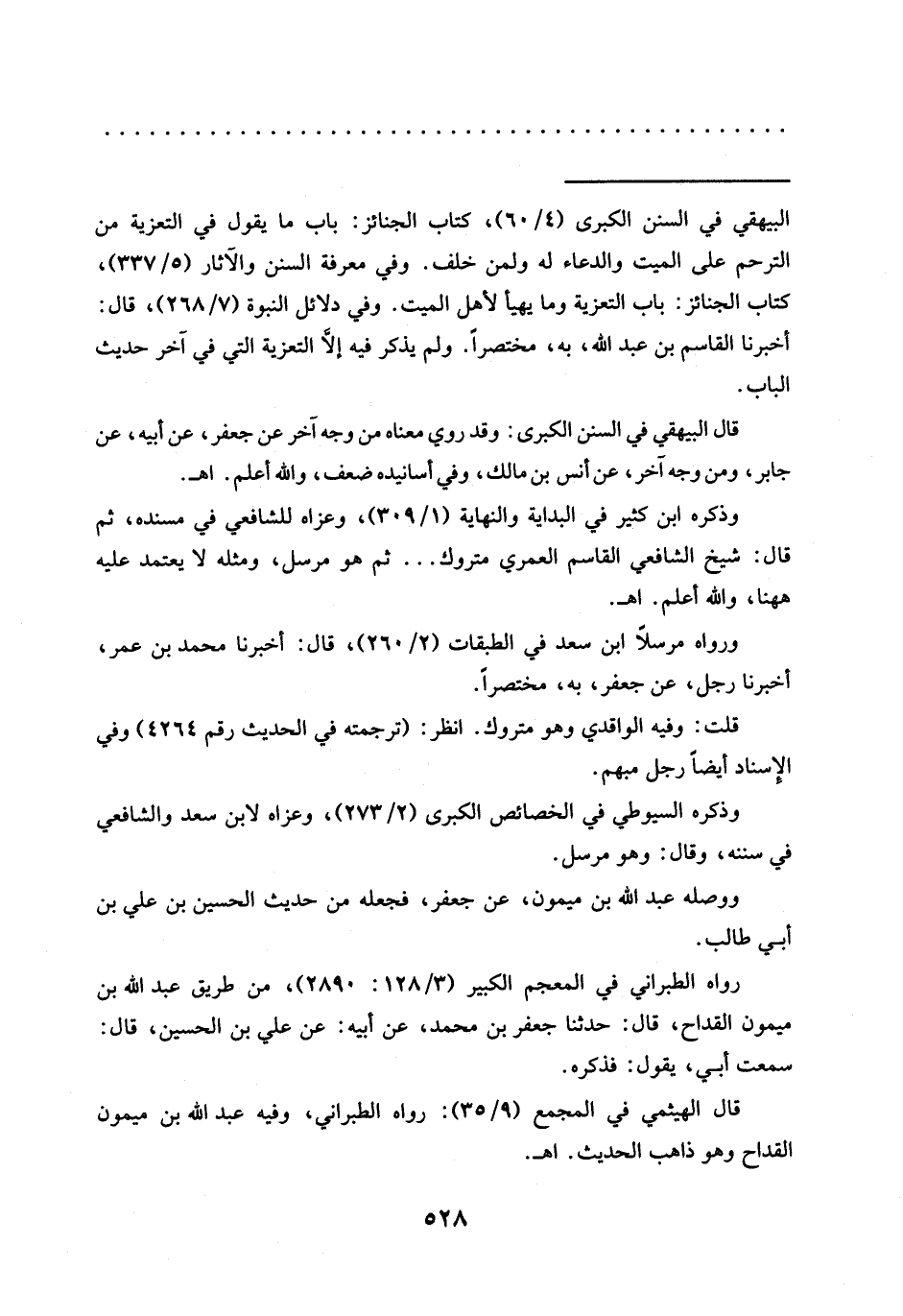 = البيهقي في السنن الكبرى (4/ 60)، كتاب الجنائز: باب ما يقول في التعزية من الترحم على الميت والدعاء له ولمن خلف. وفي معرفة السنن والآثار (5/ 337)، كتاب الجنائز: باب التعزية وما يهيأ لأهل الميت. وفي دلائل النبوة (7/ 268)، قال: أخبرنا القاسم بن عبد الله، به، مختصرًا. ولم يذكر فيه إلَّا التعزية التي في آخر حديث الباب.