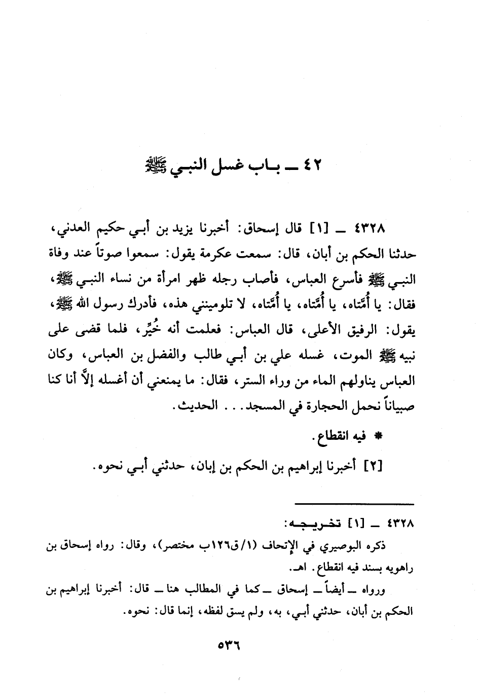 4328 -[1] قال إسحاق: أخبرنا يَزِيدُ بْنُ أَبِي حَكِيمٍ الْعَدَنِيُّ، حدثنا الْحَكَمُ بْنُ أَبَانَ، قَالَ: سَمِعْتُ عِكْرِمَةَ يَقُولُ: §سَمِعُوا صَوْتًا عِنْدَ وَفَاةِ النَّبِيِّ صَلَّى اللَّهُ عَلَيْهِ وَسَلَّمَ فَأَسْرَعَ الْعَبَّاسُ، فأصاب رِجْلُهُ ظَهْرَ امْرَأَةٍ مِنْ نِسَاءِ النَّبِيِّ صَلَّى اللَّهُ عَلَيْهِ وَسَلَّمَ فَقَالَ: يَا أُمَّتَاهُ، يَا أُمَّتَاهُ، يَا أُمَّتَاهُ، لَا تَلُومِينَنِي هَذِهِ، فَأَدْرَكَ رَسُولَ اللَّهِ صَلَّى اللَّهُ عَلَيْهِ وَسَلَّمَ، يَقُولُ: الرَّفِيقِ الْأَعْلَى، قَالَ الْعَبَّاسُ: فَعَلِمْتُ أَنَّهُ خَيْرٌ، فَلَمَّا قَضَى عَلَى نَبِيِّهِ صَلَّى اللَّهُ عَلَيْهِ وَسَلَّمَ الْمَوْتُ، غَسَّلَهُ عَلِيُّ بْنُ أَبِي طَالِبٍ وَالْفَضْلُ بْنُ الْعَبَّاسِ، وَكَانَ الْعَبَّاسُ يُنَاوِلُهُمُ الْمَاءَ مِنْ وَرَاءِ السِّتْرِ، فَقَالَ: مَا يَمْنَعُنِي أَنْ أُغَسِّلَهُ إِلَّا أَنَّا كُنَّا صِبْيَانًا نَحْمِلُ الْحِجَارَةَ فِي الْمَسْجِدِ ... الْحَدِيثُ.