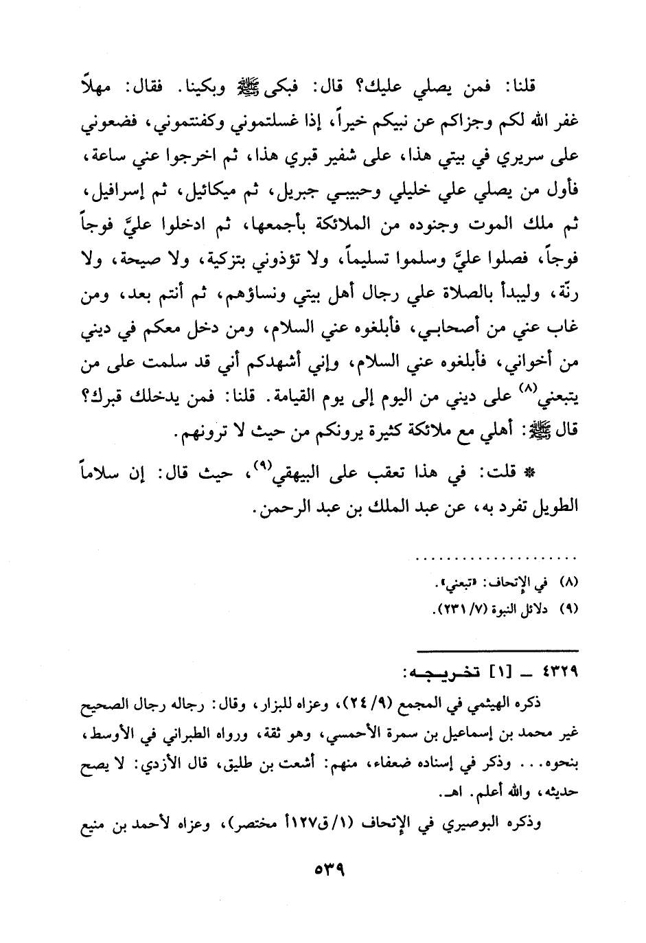 قلنا: فمن يصلي عليك؟ قال: فبكى -صلى الله عليه وسلم- وبكينا. فقال: مَهْلًا غَفَرَ اللَّهُ لَكُمْ وَجَزَاكُمْ عَنْ نَبِيِّكُمْ خَيْرًا، إِذَا غَسَّلْتُمُونِي وَكَفَّنْتُمُونِي، فَضَعُونِي عَلَى سَرِيرِي فِي بَيْتِي هَذَا، عَلَى شَفِيرِ قَبْرِي هَذَا، ثُمَّ اخْرُجُوا عَنِّي سَاعَةً، فَأَوَّلُ مَنْ يُصَلِّي عَلَيَّ خَلِيلِي وَحَبِيبِي جِبْرِيلُ، ثُمَّ مِيكَائِيلُ، ثُمَّ إِسْرَافِيلُ، ثُمَّ مَلَكُ الْمَوْتِ وَجُنُودُهُ مِنَ الْمَلَائِكَةِ بِأَجْمَعِهَا، ثُمَّ ادْخُلُوا عليَّ فَوْجًا فَوْجًا، فَصَلُّوا عليَّ وسلموا تسليمًا، ولا تؤذوني بتزكية، ولا صيحة، وَلَا رَنَّةٍ، وَلْيَبْدَأْ بِالصَّلَاةِ عليَّ رِجَالُ أَهْلِ بَيْتِي وَنِسَاؤُهُمْ، ثُمَّ أَنْتُمْ بَعْدُ، وَمَنْ غَابَ عَنِّي مِنْ أَصْحَابِي، فَأَبْلِغُوهُ عَنِّي السَّلَامَ، وَمَنْ دَخَلَ مَعَكُمْ فِي دِينِي مِنْ إِخْوَانِي، فَأَبْلِغُوهُ عَنِّي السَّلَامَ، وَإِنِّي أُشْهِدُكُمْ أَنِّي قَدْ سَلَّمْتُ على من يتبعني (¬8) على ديني من اليوم إِلَى يَوْمِ الْقِيَامَةِ. قُلْنَا: فَمَنْ يُدْخِلُكَ قَبْرَكَ؟ قال -صلى الله عليه وسلم-: أهلي مع ملائكة كثيرة يَرَوْنَكُمْ مِنْ حَيْثُ لَا تَرَوْنَهُمْ.