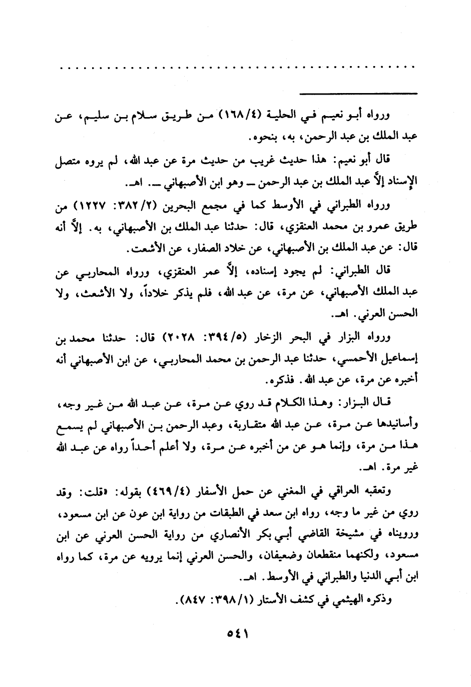 قال البزّار: وهذا الكلام قد روي عن مرة، عن عبد الله من غير وجه، وأسانيدها عن مرة، عن عبد الله متقاربة، وعبد الرحمن بن الأصبهاني لم يسمع هذا من مرة، وإنما هو عن من أخبره عن مرة، ولا أعلم أحدًا رواه عن عبد الله غير مرة. اهـ.
