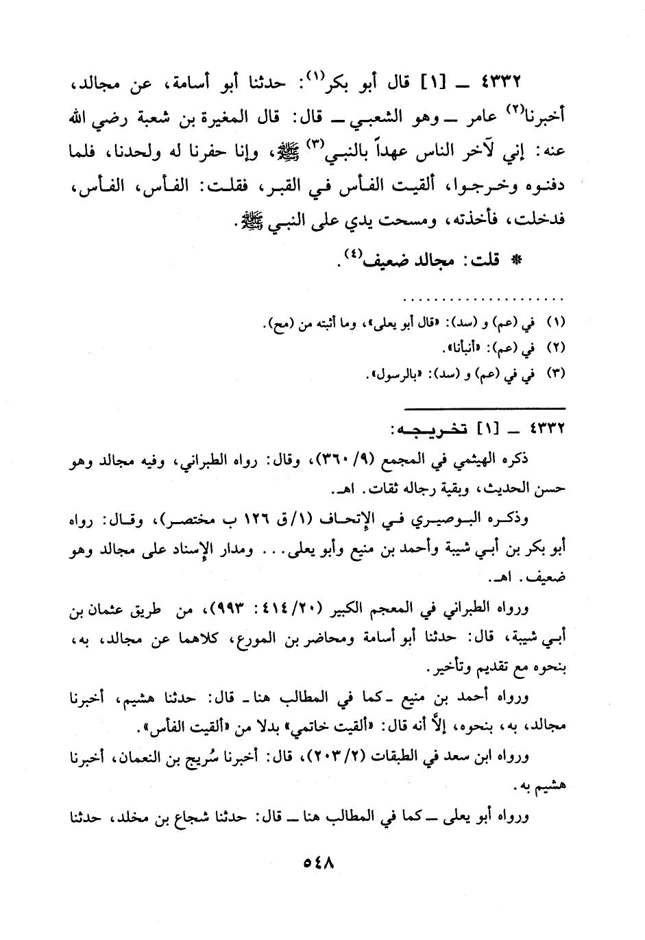 4332 -[1] قال أَبُو بَكْرٍ: حدثنا أَبُو أُسَامَةَ، عَنْ مجالد، أخبرنا عَامِرٌ - وهو الشَّعْبِيُّ - قَالَ: قَالَ الْمُغِيرَةُ بْنُ شُعْبَةَ رَضِيَ الله عَنْه: إِنِّي §لِآخِرُ النَّاسِ عَهْدًا بِالنَّبِيِّ صَلَّى اللَّهُ عَلَيْهِ وَسَلَّمَ، وإنا حَفَرْنَا لَهُ وَلَحَدْنَا، فَلَمَّا دَفَنُوهُ وَخَرَجُوا، أَلْقَيْتُ الْفَأْسَ فِي الْقَبْرِ، فَقُلْتُ: الْفَأْسَ، الْفَأْسَ، فَدَخَلْتُ، فَأَخَذْتُهُ، وَمَسَحْتَ يَدَيَّ عَلَى النَّبِيِّ صَلَّى اللَّهُ عَلَيْهِ وَسَلَّمَ.