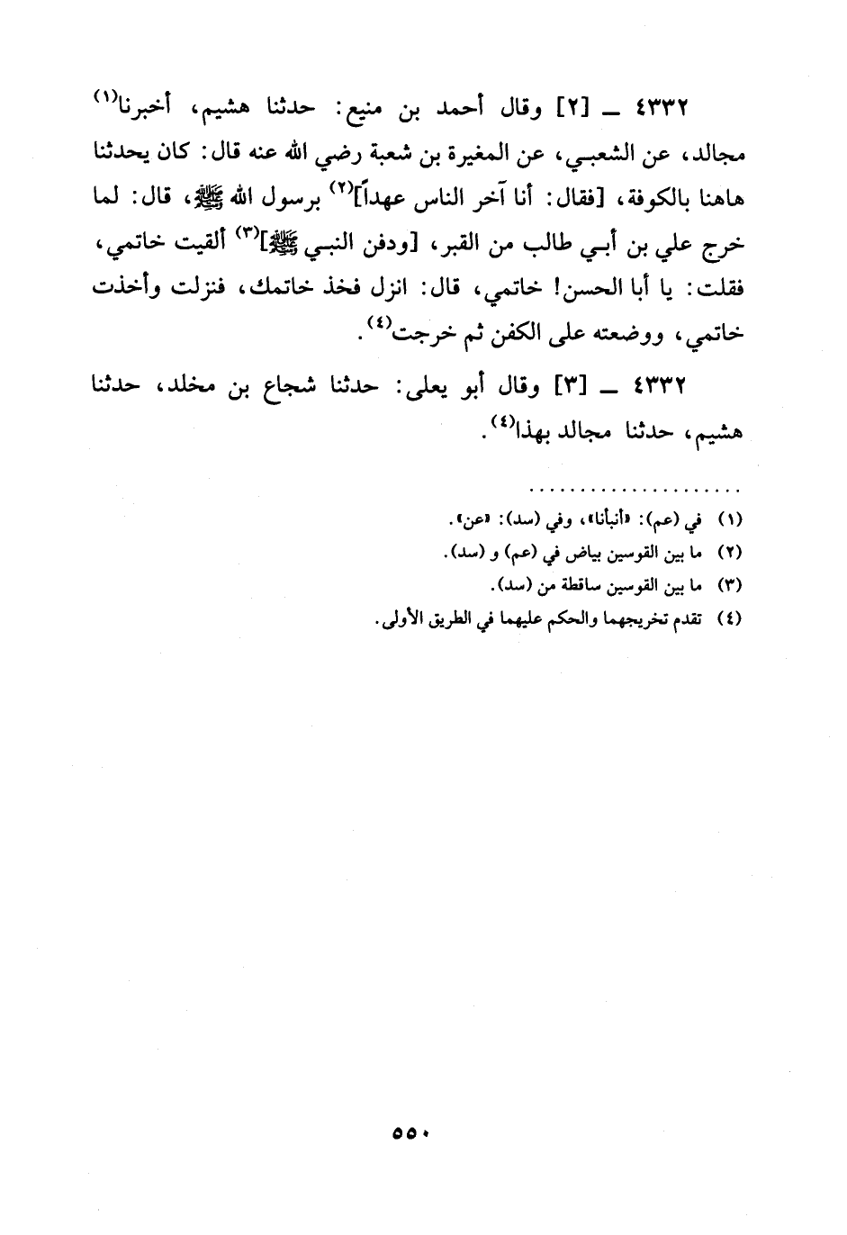 4332 -[2] وَقَالَ أَحْمَدُ بْنُ مَنِيعٍ: حدثنا هشيم، أخبرنا مُجَالِدٌ، عَنِ الشَّعْبِيِّ، عَنِ الْمُغِيرَةِ بْنِ شُعْبَةَ رَضِيَ الله عَنْه قَالَ: كان يحدثنا هاهنا بِالْكُوفَةِ، [فَقَالَ: §أَنَا آخِرُ النَّاسِ عَهْدًا] بِرَسُولِ اللَّهِ صَلَّى اللَّهُ عَلَيْهِ وَسَلَّمَ، قَالَ: لَمَّا خَرَجَ عَلِيُّ بْنُ أَبِي طَالِبٍ مِنَ الْقَبْرِ، [وَدُفِنَ النَّبِيُّ صَلَّى اللَّهُ عَلَيْهِ وَسَلَّمَ] أَلْقَيْتُ خَاتَمِي، فَقُلْتُ: يَا أَبَا الْحَسَنِ! خَاتَمِي، قَالَ: انْزِلْ فَخُذْ خَاتِمَكَ، فَنَزَلْتُ وَأَخَذْتُ خَاتَمِي، ووضعته عَلَى الْكَفَنِ ثُمَّ خَرَجْتُ.