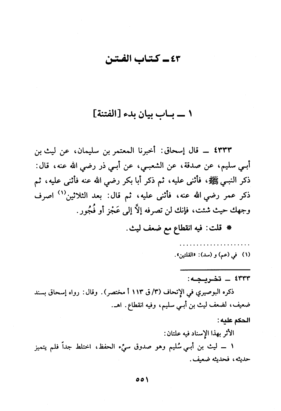 4333 - قَالَ إِسْحَاقُ: أخبرنا الْمُعْتَمِرُ بْنُ سُلَيْمَانَ، عَنْ لَيْثِ بْنِ أَبِي سُلَيْمٍ، عَنْ صَدَقَةَ، عَنِ الشَّعْبِيِّ، عَنْ أَبِي ذَرٍّ رَضِيَ الله عَنْه، قَالَ: §ذَكَرَ النَّبِيَّ صَلَّى اللَّهُ عَلَيْهِ وَسَلَّمَ، فَأَثْنَى عَلَيْهِ، ثُمَّ ذَكَرَ أَبَا بَكْرٍ رَضِيَ الله عَنْه فَأَثْنَى عَلَيْهِ، ثَمُّ ذَكَرَ عُمَرَ رَضِيَ الله عَنْه، فَأَثْنَى عَلَيْهِ، ثُمَّ قَالَ: بَعْدَ الثَّلَاثِينَ اصْرِفْ وَجْهَكَ حَيْثُ شِئْتَ، فَإِنَّكَ لَنْ تَصْرِفَهُ إِلَّا إِلَى عَجْزٍ أَوْ فُجُورٍ.