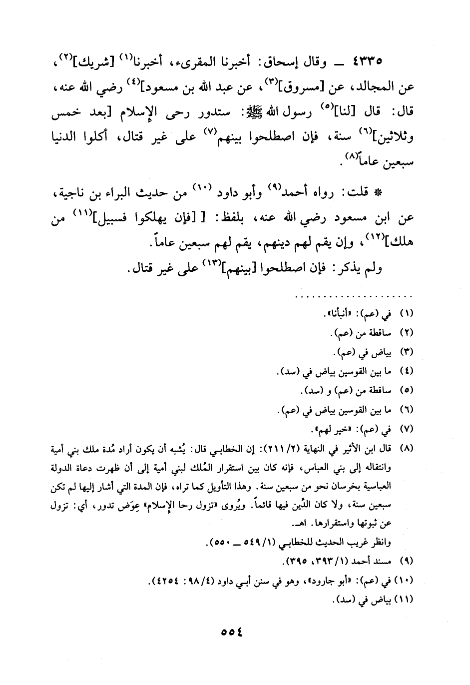 4335 - وَقَالَ إِسْحَاقُ: أخبرنا المقرئ، أخبرنا [شَرِيكٌ] ، عَنِ الْمُجَالِدِ، عَنْ [مَسْرُوقٍ] ، عَنْ عَبْدِ اللَّهِ بْنِ مَسْعُودٍ] رَضِيَ الله عَنْه، قَالَ: قَالَ [لَنَا] رَسُولُ الله صَلَّى اللَّهُ عَلَيْهِ وَسَلَّمَ: §ستدور رحى الْإِسْلَامِ [بَعْدَ خَمْسٍ وَثَلَاثِينَ] سَنَةً، فَإِنِ اصْطَلَحُوا بَيْنَهُمْ عَلَى غَيْرِ قِتَالٍ، أَكَلُوا الدُّنْيَا سَبْعِينَ عَامًا.