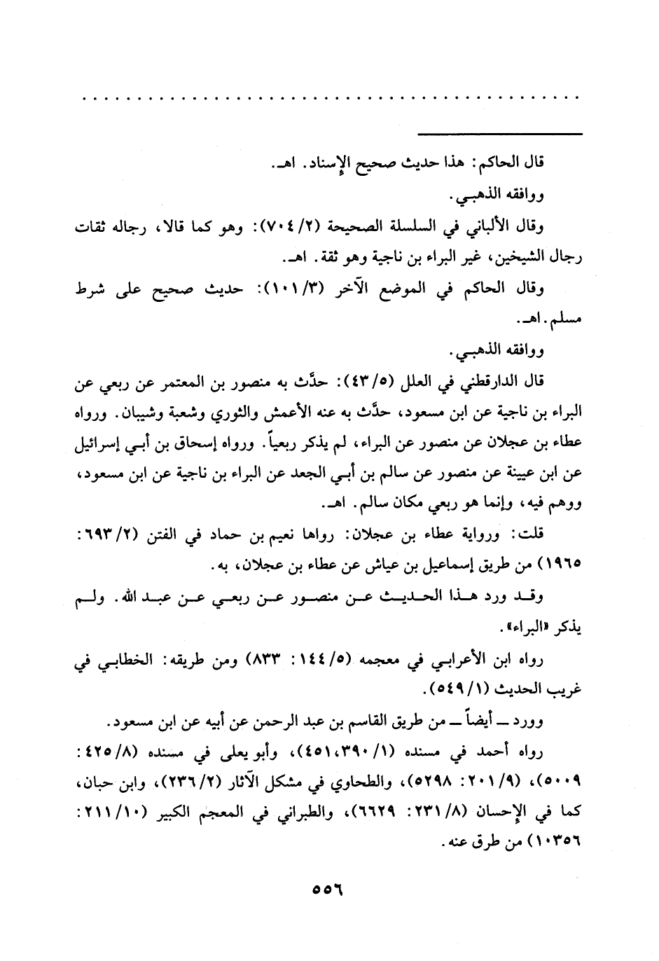 قال الدارقطني في العلل (5/ 43): حدَّث به منصور بن المعتمر عن ربعي عن البراء بن ناجية عن ابن مسعود، حدَّث به عنه الأعمش والثوري وشعبة وشيبان. ورواه عطاء بن عجلان عن منصور عن البراء، لم يذكر ربعيًا. ورواه إسحاق بن أبي إسرائيل عن ابن عيينة عَنْ مَنْصُورٍ عَنْ سَالِمِ بْنِ أَبِي الْجَعْدِ عن البراء بن ناجية عن ابن مسعود، ووهم فيه، وإنما هو ربعي مكان سالم. اهـ.