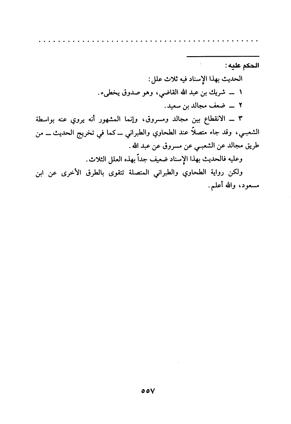 3 - الانقطاع بين مجالد ومسروق، وإنما المشهور أنه يروي عنه بواسطة الشعبي، وقد جاء متصلًا عند الطحاوي والطبراني -كما في تخريج الحديث- من طريق مجالد عن الشعبي عن مسروق عن عبد الله.