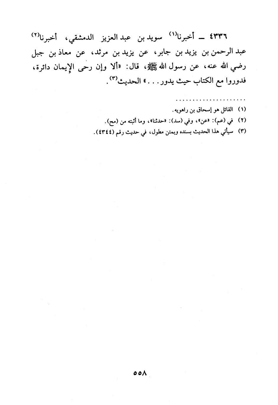 4336 - أخبرنا سُوَيْدُ بْنُ عَبْدِ العزيز الدمشقي، أخبرنا عَبْدُ الرَّحْمَنِ بْنُ يَزِيدَ بْنِ جَابِرٍ، عَنْ يَزِيدَ بْنِ مَرْثَدٍ، عَنْ مُعَاذِ بْنِ جَبَلٍ رَضِيَ الله عَنْه، عَنْ رَسُولِ اللَّهِ صَلَّى اللَّهُ عَلَيْهِ وَسَلَّمَ، قَالَ: " §ألا وإن رحى الْإِيمَانِ دَائِرَةٌ، فَدُورُوا مَعَ الْكِتَابِ حَيْثُ يَدُورُ ... " الْحَدِيثَ.