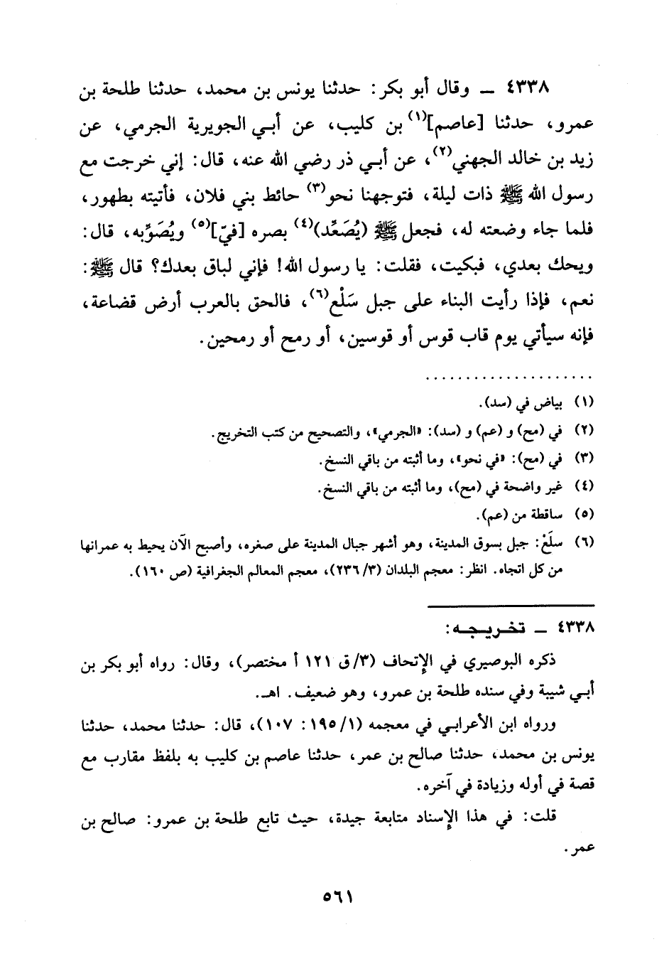 4338 - وَقَالَ أَبُو بَكْرٍ: حدثنا يُونُسُ بْنُ مُحَمَّدٍ، حدثنا طَلْحَةُ بْنُ عَمْرٍو، حدثنا [عَاصِمُ] بْنُ كُلَيْبٍ، عَنْ أَبِي الْجُوَيْرِيَةِ الجرمي، عن زيد بْنِ خَالِدٍ الجهني، عَنْ أَبِي ذَرٍّ رَضِيَ الله عَنْه، قَالَ: إِنِّي خَرَجْتُ مَعَ رَسُولِ اللَّهِ صَلَّى اللَّهُ عَلَيْهِ وَسَلَّمَ ذَاتَ لَيْلَةٍ، فَتَوَجَّهْنَا نَحْوَ حَائِطِ بَنِي فُلَانٍ، فَأَتَيْتُهُ بِطَهُورٍ، فَلَمَّا جَاءَ وَضَعْتُهُ لَهُ، فَجَعَلَ صَلَّى اللَّهُ عَلَيْهِ وَسَلَّمَ (يُصْعِدُ) بَصَرَهُ [فِيَّ] وَيُصَوِّبُهُ، قَالَ: §وَيْحَكَ بَعْدِي، فَبَكَيْتُ، فَقُلْتُ: يَا رَسُولَ اللَّهِ! فَإِنِّي لَبَاقٍ بَعْدَكَ؟ قَالَ صَلَّى اللَّهُ عَلَيْهِ وَسَلَّمَ: نَعَمْ، فَإِذَا رَأَيْتَ الْبِنَاءَ عَلَى جَبَلِ سَلْعٍ، فَالْحَقْ بِالْعَرَبِ أَرْضَ قُضَاعَةَ، فَإِنَّهُ سَيَأْتِي يَوْمٌ قَابَ قَوْسٍ أَوْ قَوْسَيْنِ، أَوْ رُمْحٍ أَوْ رُمْحَيْنِ.