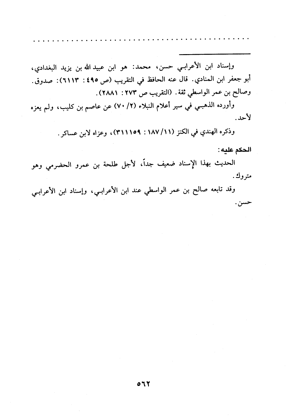 = وإسناد ابن الأعرابي حسن، محمد: هو ابن عبيد الله بن يزيد البغدادي، أبو جعفر ابن المنادي. قال عنه الحافظ في التقريب (ص 495: 6113): صدوق.