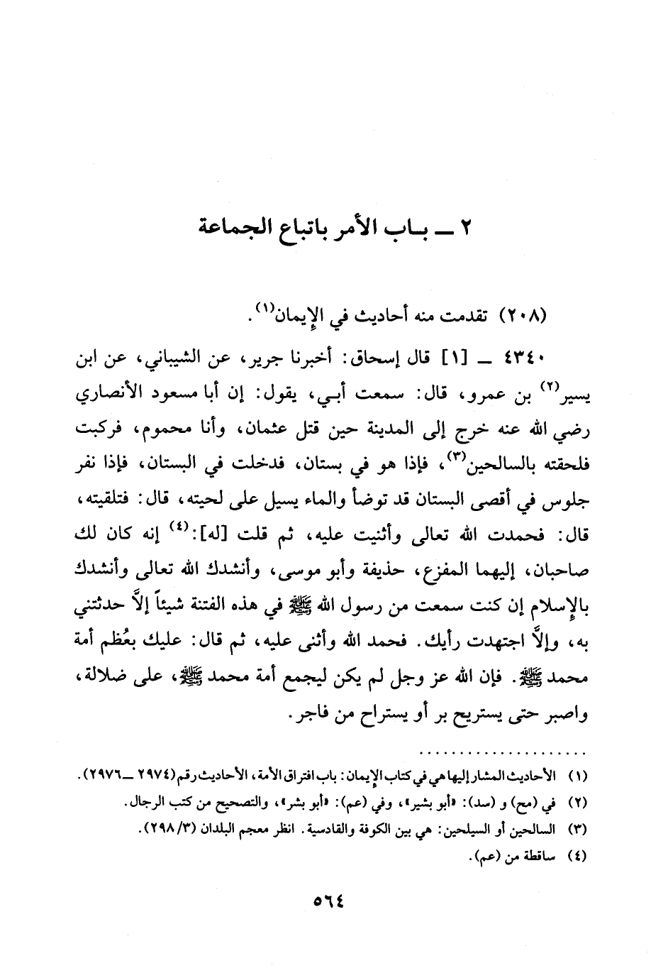 4340 -[1] قال إسحاق: أخبرنا جَرِيرٌ، عَنِ الشَّيْبَانِيِّ، عن ابن يسير بْنِ عَمْرٍو، قَالَ: سَمِعْتُ أَبِي، يَقُولُ: إِنَّ أَبَا مَسْعُودٍ الْأَنْصَارِيَّ رَضِيَ الله عَنْه خَرَجَ إِلَى الْمَدِينَةِ حِينَ قُتِلَ عُثْمَانُ، وَأَنَا مَحْمُومٌ، فَرَكِبْتُ فَلَحِقْتُهُ بِالسَّالِحِينَ، فَإِذَا هُوَ فِي بُسْتَانٍ، فَدَخَلْتُ فِي الْبُسْتَانِ، فَإِذَا نَفَرٌ جُلُوسٌ فِي أَقْصَى الْبُسْتَانِ قَدْ تَوَضَّأَ وَالْمَاءُ يَسِيلُ عَلَى لِحْيَتِهِ، قَالَ: فَتَلَقَّيْتُهُ، قَالَ: فحمدت الله تعالى وَأَثْنَيْتُ عَلَيْهِ، ثُمَّ قُلْتُ [لَهُ] : إِنَّهُ كَانَ لَكَ صَاحِبَانِ، إِلَيْهِمَا الْمَفْزَعُ، حُذَيْفَةُ وَأَبُو مُوسَى، وأنشدك الله تعالى وَأَنْشُدُكَ بِالْإِسْلَامِ إِنْ كُنْتَ سَمِعْتَ مِنَ رَسُولِ اللَّهِ صَلَّى اللَّهُ عَلَيْهِ وَسَلَّمَ فِي هَذِهِ الْفِتْنَةِ شَيْئًا إِلَّا حَدَّثْتَنِي بِهِ، وَإِلَّا اجْتَهَدْتَ رَأْيَكَ. فَحَمِدَ اللَّهَ وَأَثْنَى عَلَيْهِ، ثُمَّ قَالَ: §عَلَيْكَ بِعُظْمِ أُمَّةِ مُحَمَّدٍ صَلَّى اللَّهُ عَلَيْهِ وَسَلَّمَ. فإن الله عز وجل لَمْ يَكُنْ لِيَجْمَعَ أُمَّةَ مُحَمَّدٍ صَلَّى اللَّهُ عَلَيْهِ وَسَلَّمَ، عَلَى ضَلَالَةٍ، وَاصْبِرْ حَتَّى يَسْتَرِيحَ بَرٌّ أَوْ يُسْتَرَاحَ مِنْ فَاجِرٍ.
