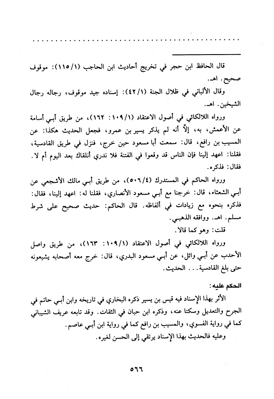 ورواه اللالكائي في أصول الاعتقاد (1/ 109: 162)، من طريق أبي أسامة عن الأعمش، به، إلَّا أنه لم يذكر يسير بن عمرو، فجعل الحديث هكذا: عن المسيب بن رافع، قال: سمعت أبا مسعود حين خرج، فنزل في طريق القادسية، فقلنا: اعهد إلينا فإن الناس قد وقعوا في الفتنة فلا ندري أنلقاك بعد اليوم أم لا. فقال: فذكره.
