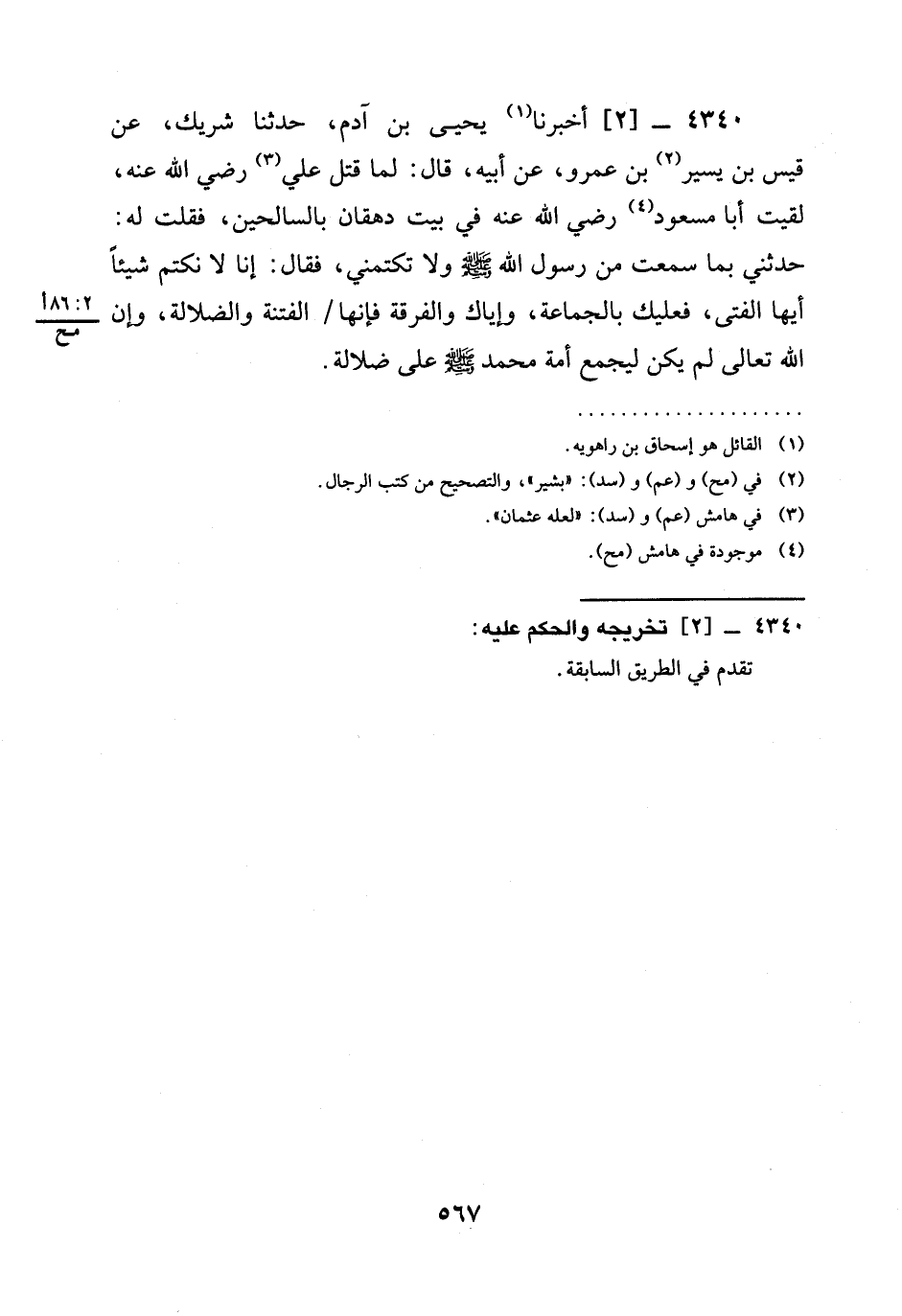 4340 -[2] أَخْبَرَنَا يَحْيَى بْنُ آدَمَ، حدثنا شَرِيكٌ، عَنْ قَيْسِ بْنِ يَسِيرِ بْنِ عَمْرٍو، عَنْ أَبِيهِ، قَالَ: لَمَّا قُتِلَ عَلِيٌّ رَضِيَ الله عَنْهُ، لَقِيتُ أَبَا مَسْعُودٍ رَضِيَ الله عَنْهُ فِي بَيْتِ دِهْقَانَ بِالسَّالِحِينَ، فَقُلْتُ لَهُ: حَدِّثْنِي بِمَا سَمِعْتَ مِنْ رَسُولِ اللَّهِ صَلَّى اللَّهُ عَلَيْهِ وَسَلَّمَ وَلَا تَكْتُمْنِي، فَقَالَ: §إِنَّا لَا نَكْتُمُ شَيْئًا أَيُّهَا الْفَتَى، فَعَلَيْكَ بِالْجَمَاعَةِ، وَإِيَّاكَ وَالْفُرْقَةَ فَإِنَّهَا / الْفِتْنَةُ وَالضَّلَالَةُ، وإن الله تعالى لَمْ يَكُنْ لَيَجْمَعَ أُمَّةَ مُحَمَّدٍ صَلَّى اللَّهُ عَلَيْهِ وَسَلَّمَ عَلَى ضَلَالَةٍ.