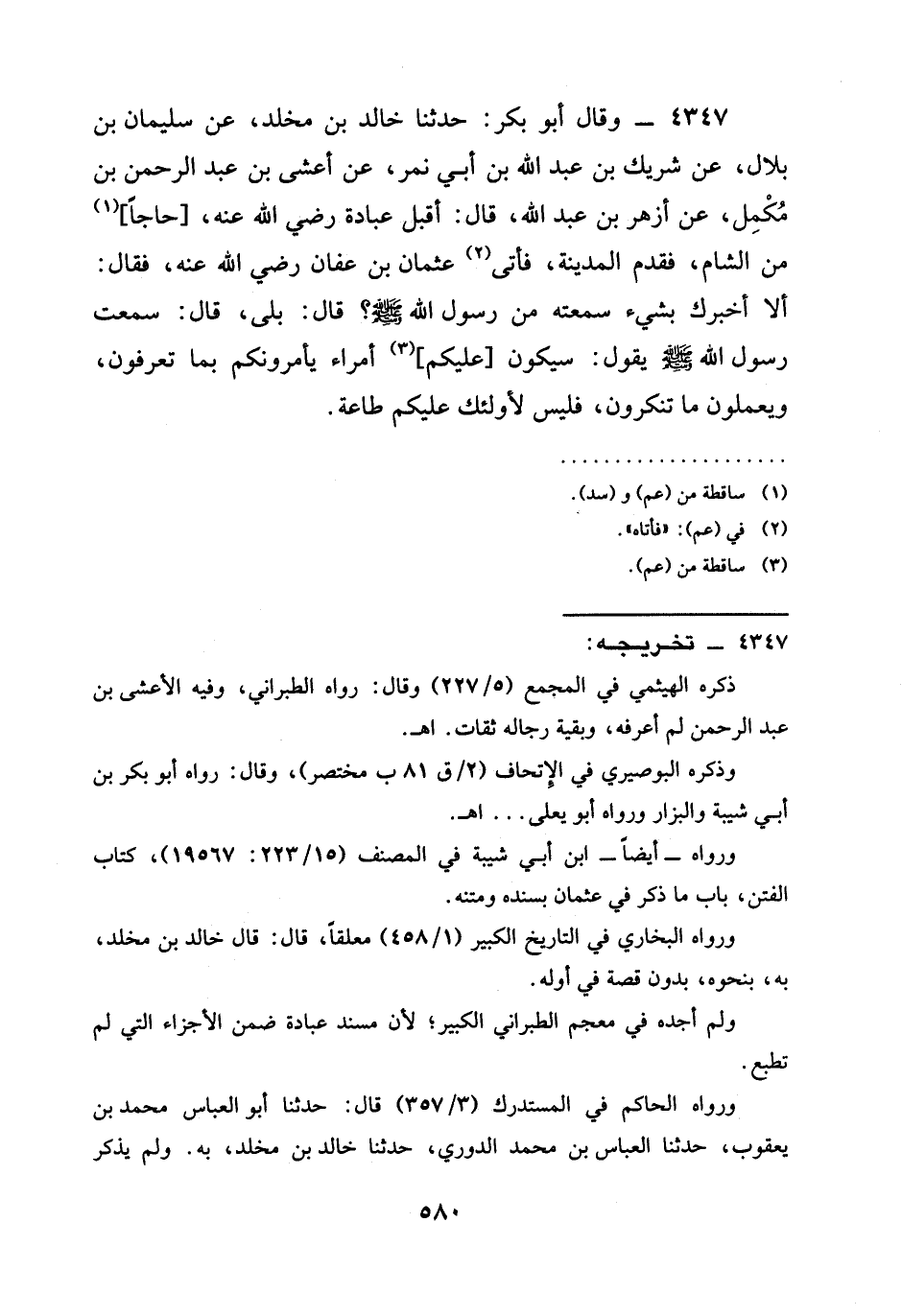 4347 - وَقَالَ أَبُو بَكْرٍ: حَدَّثَنَا خَالِدُ بْنُ مَخْلَدٍ، عَنْ سُلَيْمَانَ بْنِ بِلَالٍ، عَنْ شَرِيكِ بْنِ عَبْدِ اللَّهِ بْنِ أَبِي نَمِرٍ، عَنْ أَعْشَى بْنِ عَبْدِ الرَّحْمَنِ بْنِ مُكْمِلٍ، عَنْ أَزْهَرَ بْنِ عَبْدِ اللَّهِ، قَالَ: أَقْبَلَ عُبَادَةُ رَضِيَ الله عَنْه، [حَاجًّا] مِنَ الشَّامِ، فَقَدِمَ الْمَدِينَةَ، فَأَتَى عُثْمَانَ بْنَ عَفَّانَ رَضِيَ الله عَنْه، فَقَالَ: أَلَا أُخْبِرُكَ بِشَيْءٍ سَمِعْتُهُ مِنْ رَسُولِ اللَّهِ صَلَّى اللَّهُ عَلَيْهِ وَسَلَّمَ؟ قَالَ: بَلَى، قَالَ: سَمِعْتُ رَسُولَ اللَّهِ صَلَّى اللَّهُ عَلَيْهِ وَسَلَّمَ يَقُولُ: §سَيَكُونُ [عَلَيْكُمْ] أُمَرَاءُ يَأْمُرُونَكُمْ بِمَا تَعْرِفُونَ، وَيَعْمَلُونَ مَا تُنْكِرُونَ، فَلَيْسَ لِأُولَئِكَ عَلَيْكُمْ طَاعَةٌ.