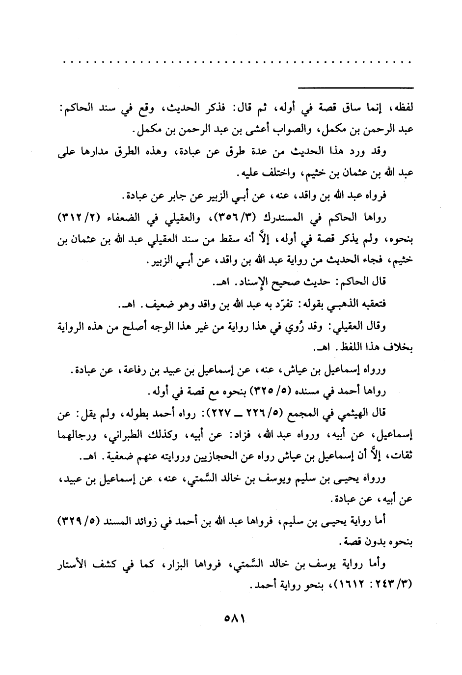 رواها الحاكم في المستدرك (3/ 356)، والعقيلي في الضعفاء (2/ 312) بنحوه، ولم يذكر قصة في أوله، إلَّا أنه سقط من سند العقيلي عبد الله بن عثمان بن خثيم، فجاء الحديث من رواية عبد الله بن واقد، عن أبي الزبير.