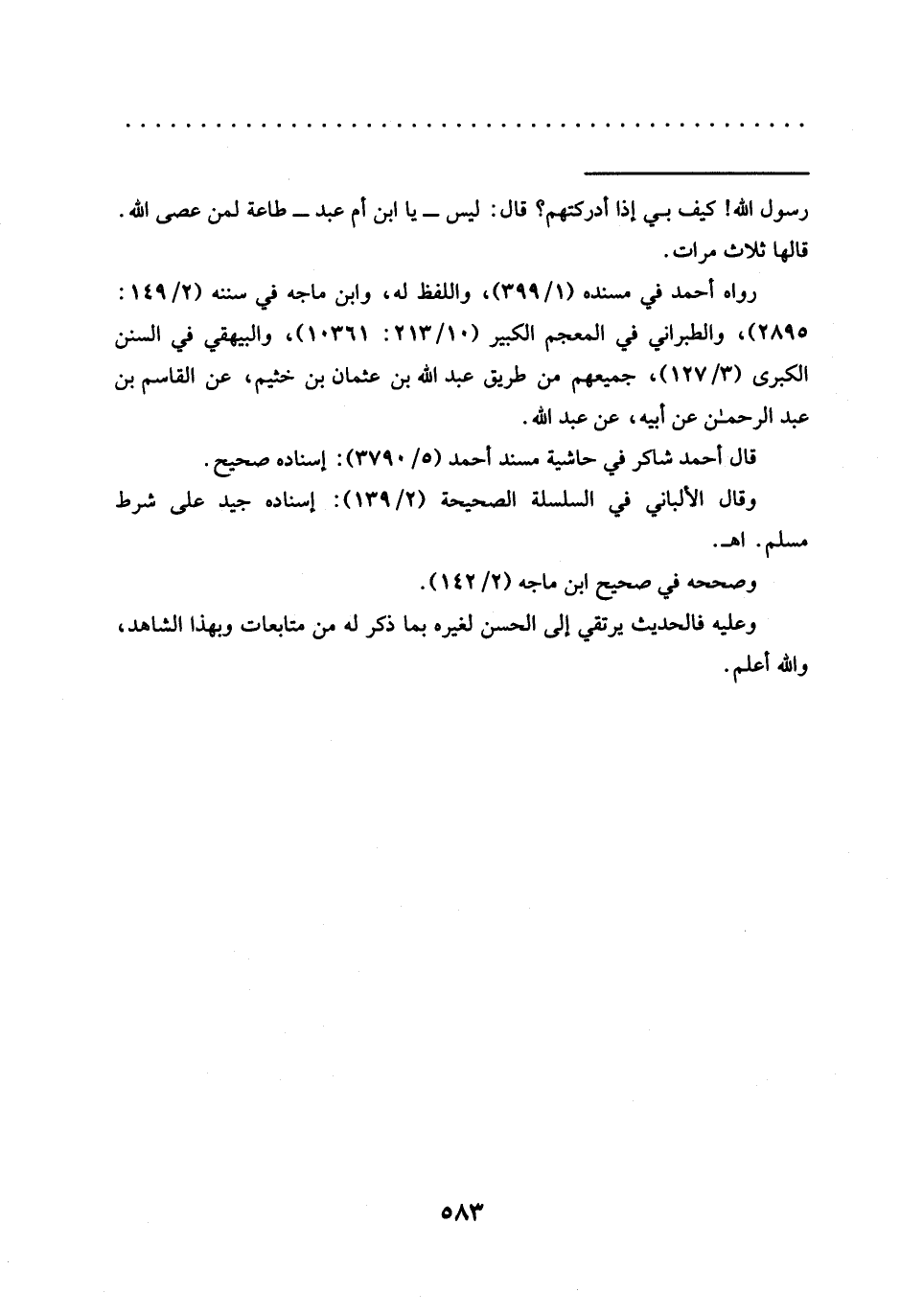 = رَسُولَ اللَّهِ -صَلَّى اللَّهُ عَلَيْهِ وَسَلَّمَ-! كيف بي إذا أدركتهم؟ قال: ليس -يا ابن أم عبد- طاعة لمن عصى الله. قالها ثلاث مرات.