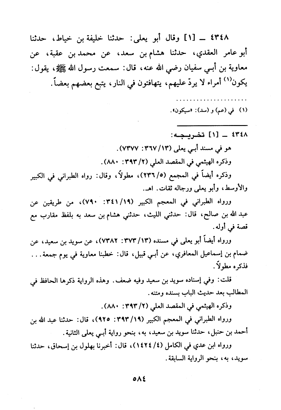 4348 -[1] وَقَالَ أَبُو يَعْلَى: حَدَّثَنَا خَلِيفَةُ بْنُ خَيَّاطٍ، حَدَّثَنَا أَبُو عَامِرٍ الْعَقَدِيُّ، حَدَّثَنَا هِشَامُ بْنُ سَعْدٍ، عَنْ مُحَمَّدِ بْنِ عُقْبَةَ، عَنْ مُعَاوِيَةَ بْنِ أَبِي سُفْيَانَ رَضِيَ الله عَنْه، قَالَ: سَمِعْتُ رَسُولَ اللَّهِ صَلَّى اللَّهُ عَلَيْهِ وَسَلَّمَ، يَقُولُ: §يَكُونُ أُمَرَاءُ لَا يُرَدُّ عَلَيْهِمْ، يَتَهَافَتُونَ فِي النَّارِ، يَتْبَعُ بَعْضُهُمْ بَعْضًا.