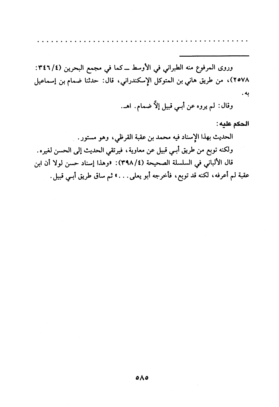 ولكنه توبع من طريق أبي قبيل عن معاوية، فيرتقي الحديث إلى الحسن لغيره.
