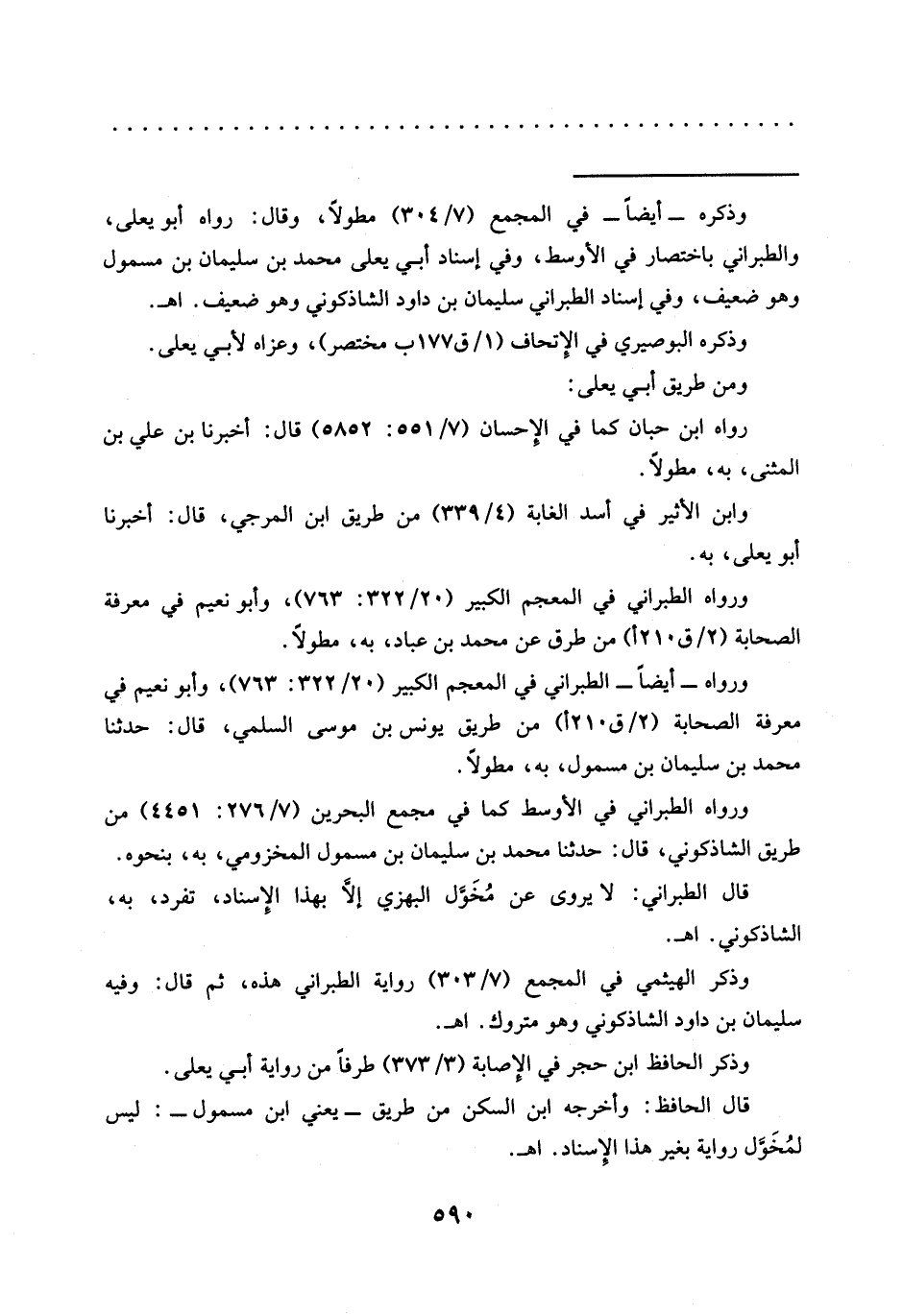 ورواه -أيضًا- الطبراني في المعجم الكبير (20/ 322: 763)، وأبو نعيم في معرفة الصحابة (2/ ق 210 أ) من طريق يونس بن موسى السلمى، قال: حدَّثنا محمد بن سليمان بن مسمول، به، مطولًا.