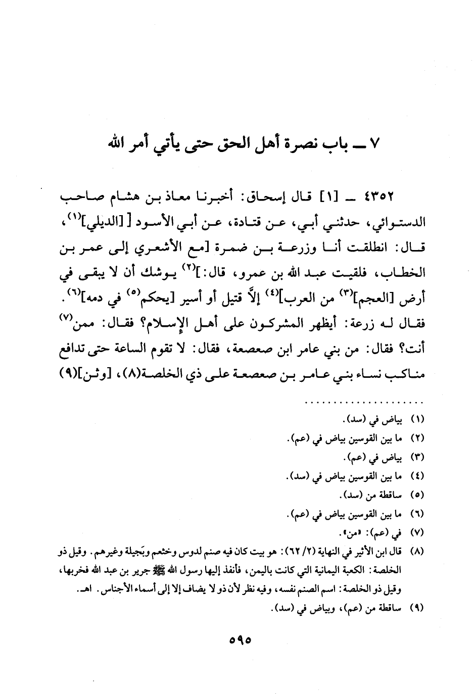 4352 -[1] قَالَ إِسْحَاقُ: أخبرنا مُعَاذُ بْنُ هِشَامٍ صَاحِبُ الدَّسْتُوَائِيِّ، حدثني أبي، عَنْ قَتَادَةَ، عَنْ أَبِي الْأَسْوَدِ [[الديلي] ، قَالَ: انْطَلَقْتُ أَنَا وَزُرْعَةُ بْنُ ضَمْرَةَ [مَعَ الْأَشْعَرِيِّ إِلَى عُمَرَ بْنِ الْخَطَّابِ، فلقيت عَبْدُ اللَّهِ بْنُ عَمْرٍو، قَالَ:] يُوشِكُ أَنْ لَا يَبْقَى فِي أَرْضِ [الْعَجَمِ] مِنَ الْعَرَبِ] إِلَّا قَتِيلٌ أَوْ أَسِيرٌ [يُحْكَمُ فِي دَمِهِ] . فَقَالَ لَهُ زُرْعَةُ: أَيَظْهَرُ الْمُشْرِكُونَ عَلَى أَهْلِ الْإِسْلَامِ؟ فَقَالَ: مِمَّنْ أَنْتَ؟ فَقَالَ: مِنْ بَنِي عَامِرِ ابن صَعْصَعَةَ، فَقَالَ: لَا تَقُومُ السَّاعَةُ حَتَّى تَدَافَعَ مَنَاكِبُ نِسَاءِ بَنِي عَامِرِ بْنِ صَعْصَعَةَ عَلَى ذِي الْخَلَصَةِ، [وَثَنٌ]