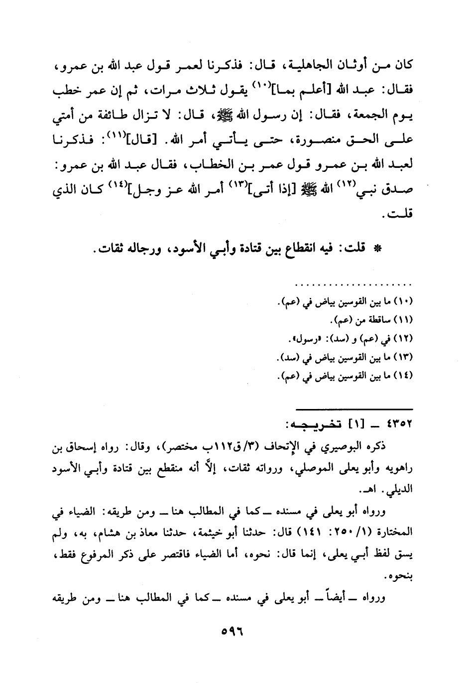 ذكره البوصيري في الإِتحاف (3/ ق 112 ب مختصر)، وقال: رواه إسحاق بن راهويه وأبو يعلى الموصلي، ورواته ثقات، إلَّا أنه منقطع بين قتادة وأبي الأسود الديلي. اهـ.