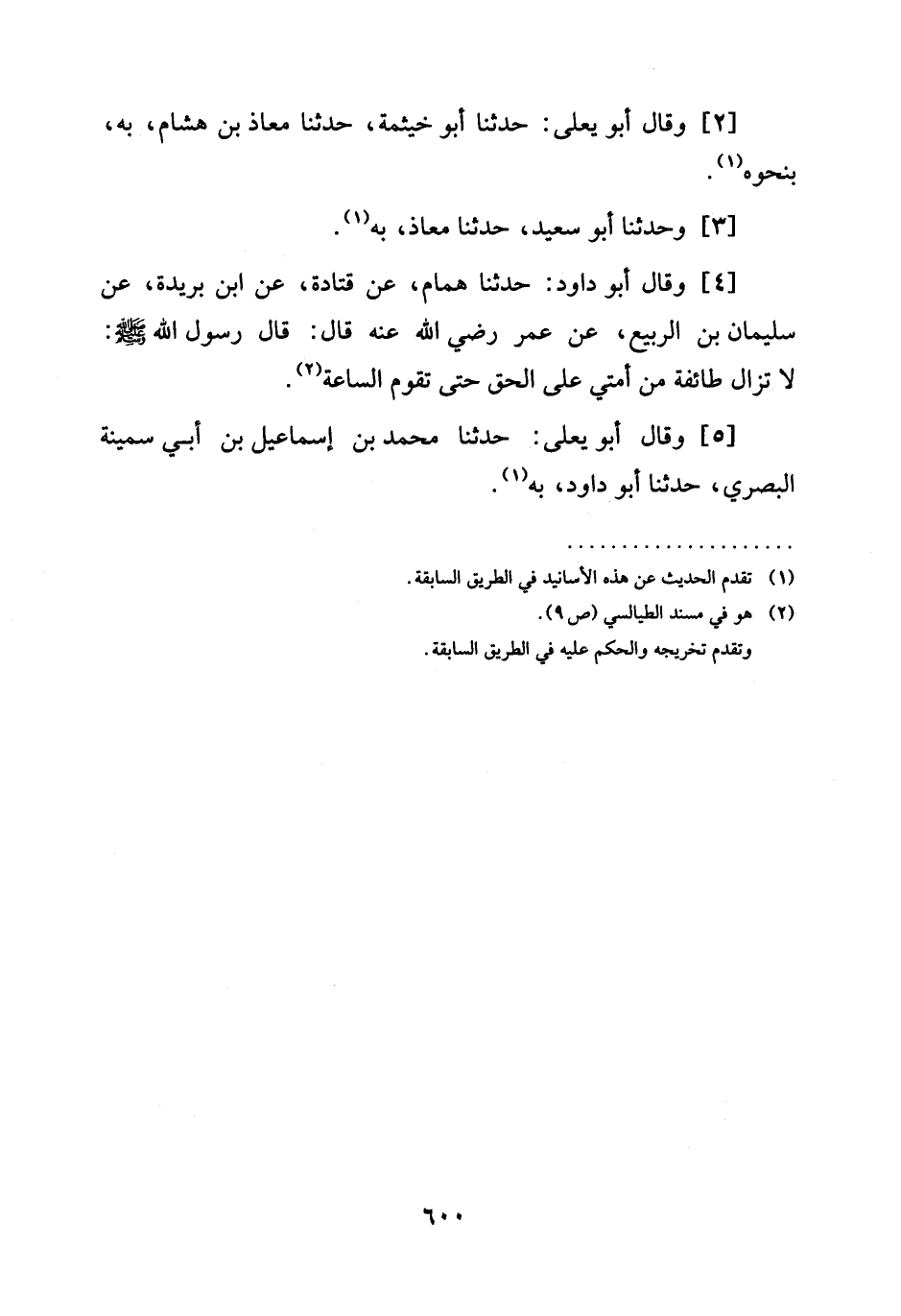[4] وَقَالَ أبو داود: حَدَّثَنَا هَمَّامٌ، عَنْ قَتَادَةَ، عَنِ ابْنِ بُرَيْدَةَ، عَنْ سُلَيْمَانَ بْنِ الرَّبِيعِ، عَنْ عُمَرَ رَضِيَ الله عَنْه قَالَ: قَالَ رَسُولُ اللَّهِ صَلَّى اللَّهُ عَلَيْهِ وَسَلَّمَ: §لَا تَزَالُ طَائِفَةٌ مِنْ أُمَّتِي عَلَى الْحَقِّ حَتَّى تَقُومَ السَّاعَةُ.
