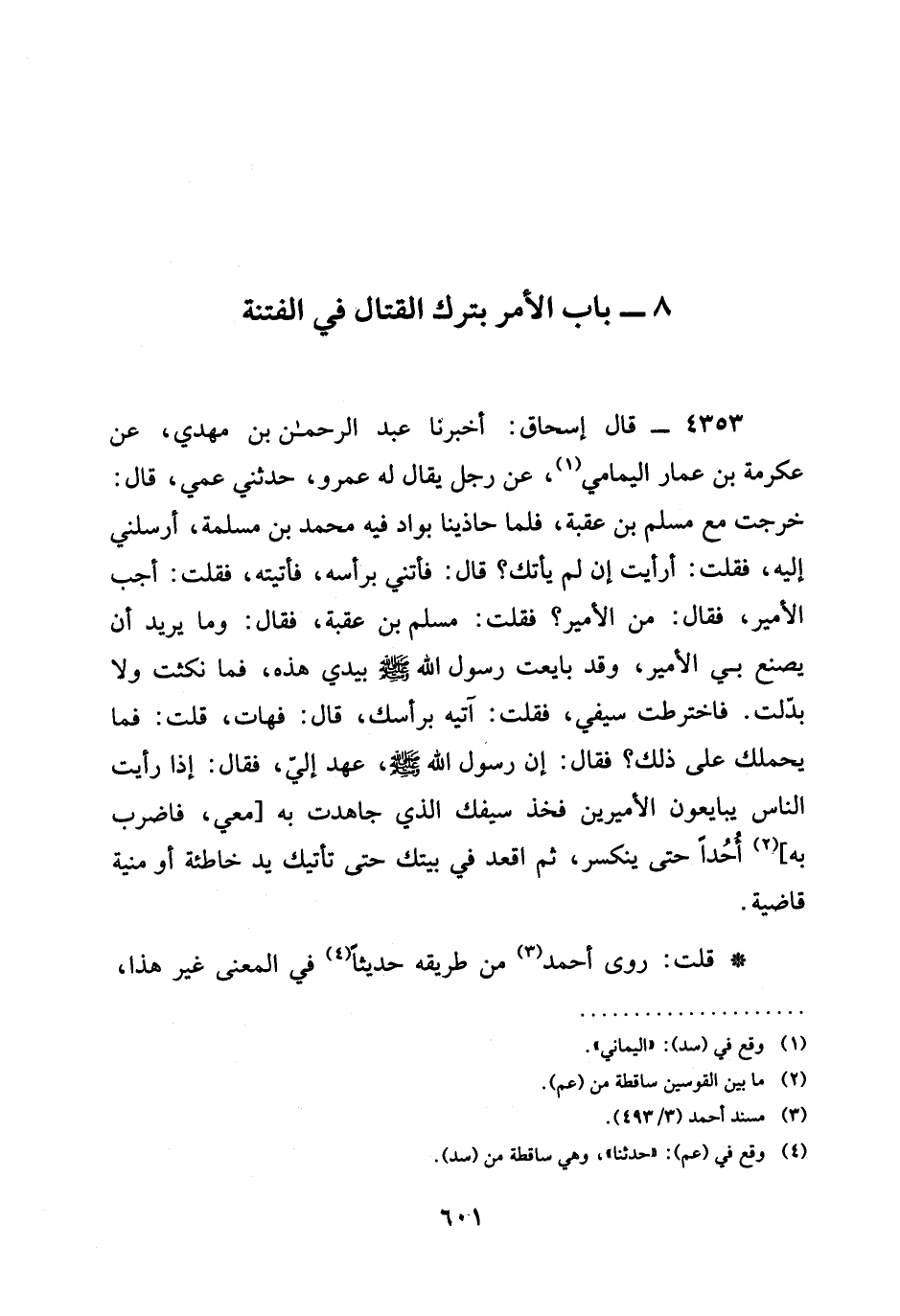 4353 - قَالَ إِسْحَاقُ: أخبرنا عَبْدُ الرَّحْمَنِ بْنُ مَهْدِيٍّ، عَنْ عِكْرِمَةَ بْنِ عَمَّارٍ الْيَمَامِيِّ، عَنْ رَجُلٍ يُقَالُ لَهُ عَمْرٌو، حَدَّثَنِي عَمِّي، قَالَ: خَرَجْتُ مَعَ مُسْلِمِ بْنِ عُقْبَةَ، فَلَمَّا حَاذَيْنَا بِوَادٍ فِيهِ مُحَمَّدُ بْنُ مَسْلَمَةَ، أَرْسَلَنِي إِلَيْهِ، فَقُلْتُ: أَرَأَيْتَ إِنْ لَمْ يَأْتِكَ؟ قَالَ: فَأْتِنِي بِرَأْسِهِ، فَأَتَيْتُهُ، فَقُلْتُ: أَجِبِ الْأَمِيرَ، فَقَالَ: مَنِ الْأَمِيرُ؟ فَقُلْتُ: مُسْلِمُ بْنُ عُقْبَةَ، فَقَالَ: وَمَا يُرِيدُ أَنْ يَصْنَعَ بِيَ الْأَمِيرُ، وَقَدْ بَايَعْتُ رَسُولَ اللَّهِ صَلَّى اللَّهُ عَلَيْهِ وَسَلَّمَ بِيَدِي هَذِهِ، فَمَا نَكَثْتُ وَلَا بَدَّلْتُ. فَاخْتَرَطْتُ سَيْفِي، فَقُلْتُ: آتِيهِ بِرَأْسِكَ، قَالَ: فَهَاتِ، قُلْتُ: فَمَا يَحْمِلُكَ عَلَى ذَلِكَ؟ فَقَالَ: إِنَّ رَسُولَ اللَّهِ صَلَّى اللَّهُ عَلَيْهِ وَسَلَّمَ، عَهِدَ إِلَيَّ، فَقَالَ: §إِذَا رَأَيْتَ النَّاسَ يُبَايِعُونَ الْأَمِيرَيْنِ فَخُذْ سَيْفَكَ الَّذِي جَاهَدْتَ بِهِ [مَعِي، فَاضْرِبْ بِهِ] أُحُدًا حَتَّى يَنْكَسِرَ، ثُمَّ اقْعُدْ فِي بَيْتِكَ حَتَّى تَأْتِيَكَ يَدٌ خَاطِئَةٌ أَوْ مَنِيَّةٌ قَاضِيَةٌ.