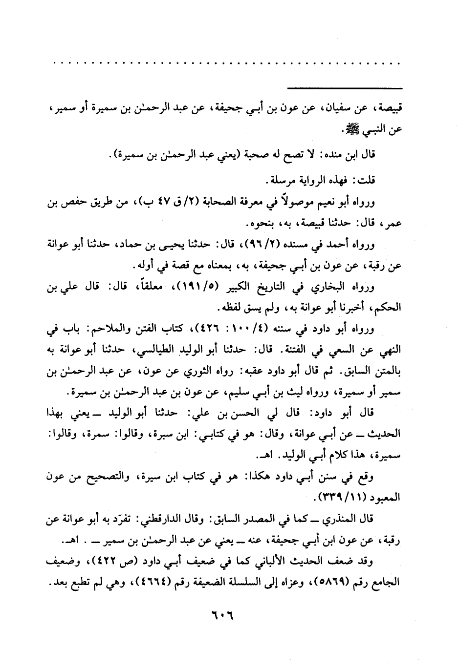 قال المنذري- كما في المصدر السابق: وقال الدارقطني: تفرَّد به أبو عوانة عن رقبة، عن عون ابن أبي جحيفة، عنه -يعني عن عبد الرحمن بن سمير-. اهـ.
