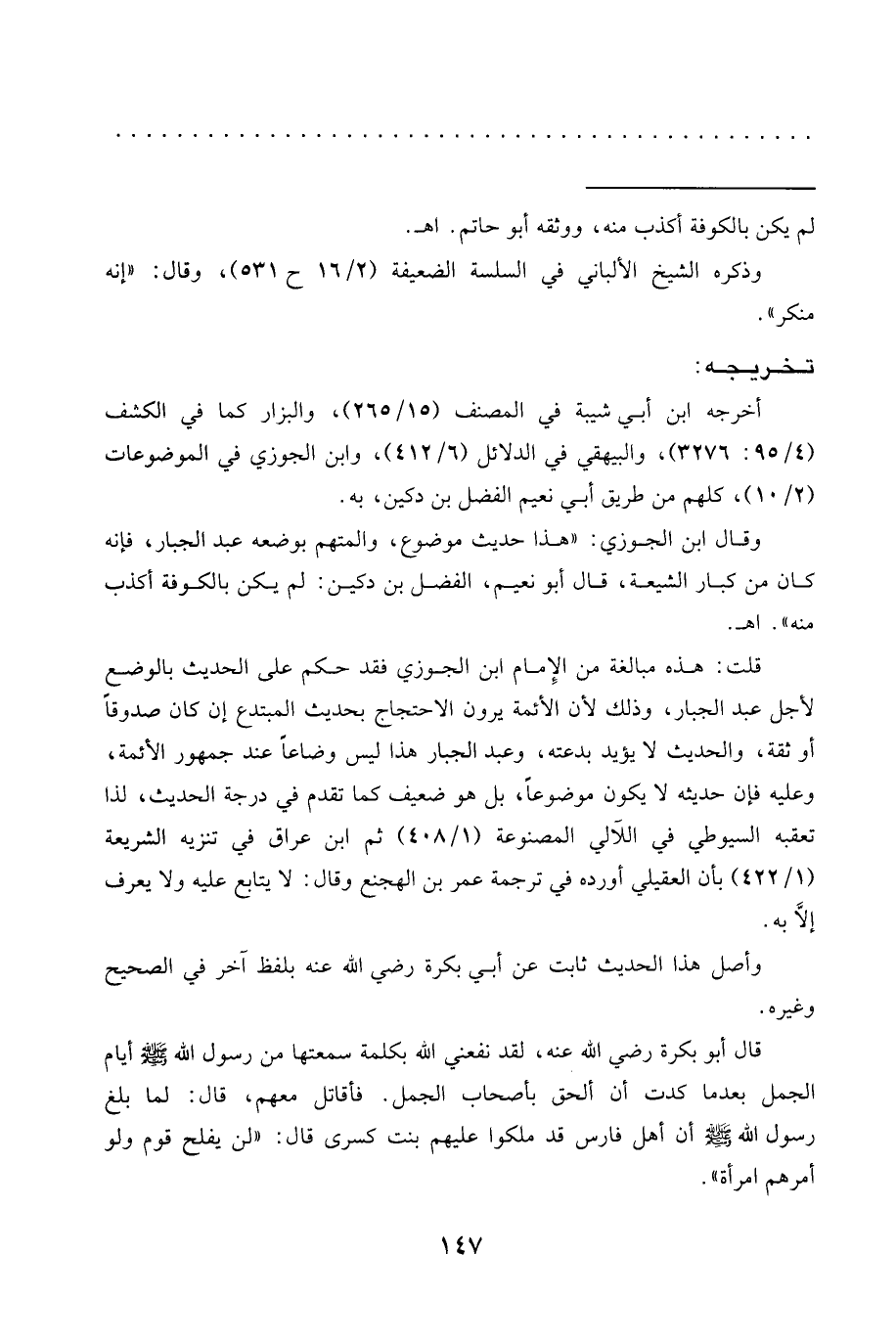 قال أبو بكرة رضي الله عنه، لقد نفعني الله بكلمة سَمِعْتُهَا مِنْ رَسُولِ اللَّهِ -صَلَّى اللَّهُ عَلَيْهِ وسلم- أيام الجمل بعد ما كدت أن ألحق بأصحاب الجمل. فأقاتل معهم، قال: لما بلغ رسول الله -صلى الله عليه وسلم- أن أهل فارس قد ملكوا عليهم بنت كسرى قال: "لن يفلح قوم ولو أمرهم امرأة". =