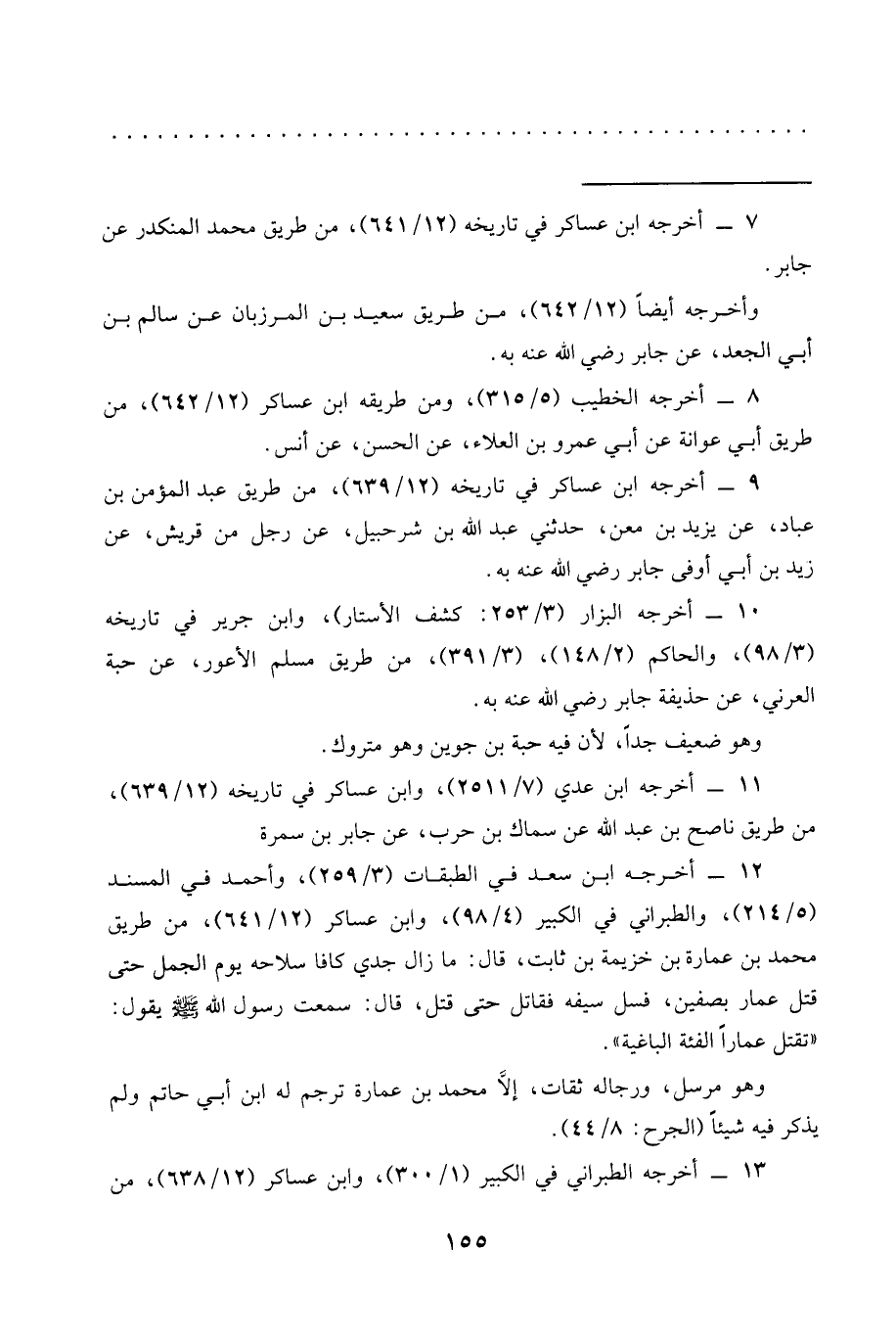 12 - أخرجه ابن سعد في الطبقات (3/ 259)، وأحمد في المسند (5/ 214)، والطبراني في الكبير (4/ 98)، وابن عساكر (12/ 641)، من طريق محمَّد بن عمارة بن خزيمة بن ثابت، قال: ما زال جدي كافا سلاحه يوم الجمل حتى قتل عمار بصفين، غسل سيفه فقاتل حتى قتل، قال: سمعت رسول الله -صلى الله عليه وسلم- يقول: "تقتل عمارًا الفئة الباغية".