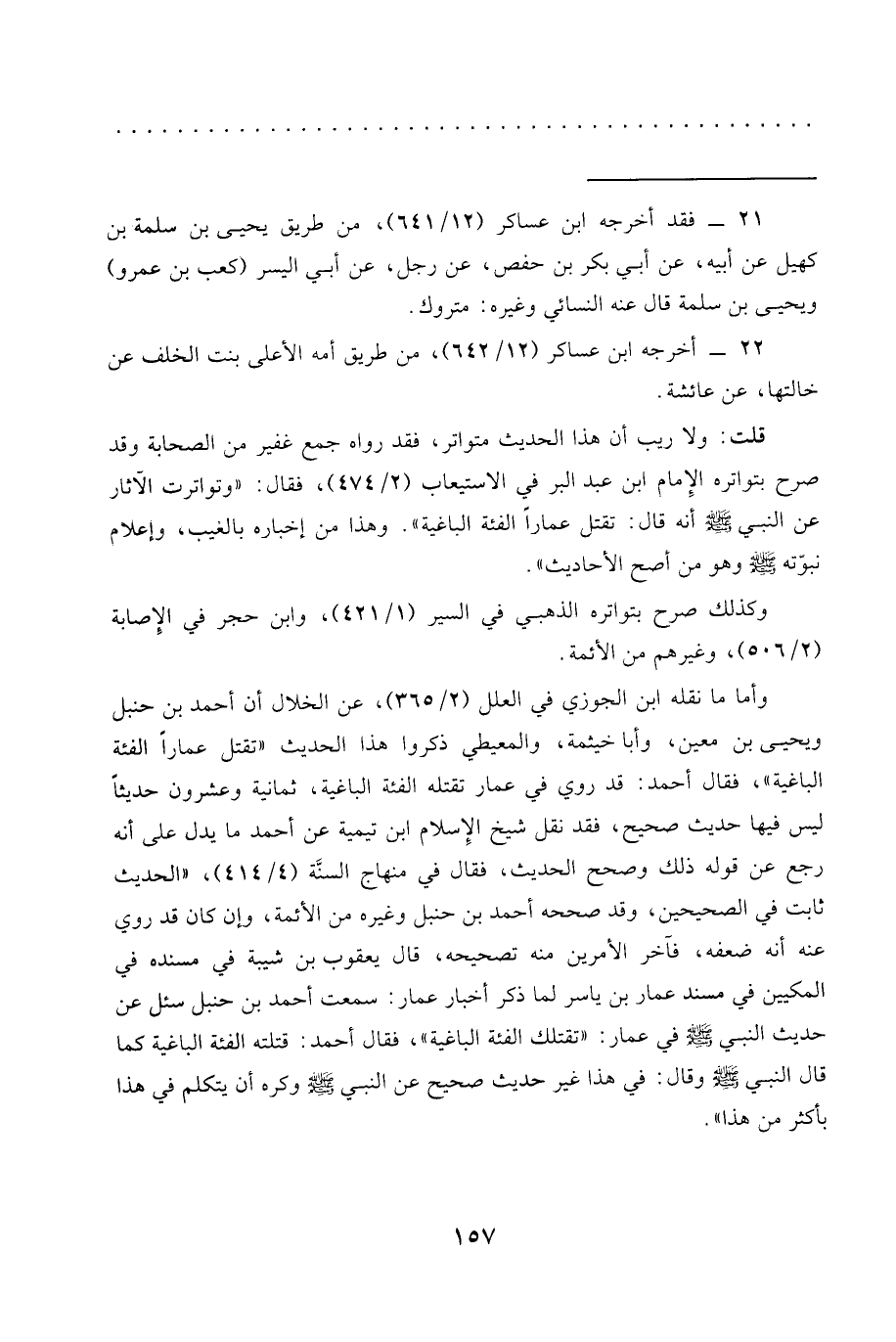 قلت: ولا ريب أن هذا الحديث متواتر، فقد رواه جمع غفير من الصحابة وقد صرح بتواتره الإِمام ابن عبد البر فى الاستيعاب (2/ 474)، فقال: "وتواترت الآثار عَنِ النَّبِيِّ -صَلَّى اللَّهُ عَلَيْهِ وَسَلَّمَ- أَنَّهُ قال: تقتل عمارًا الفئة الباغية". وهذا من إخباره بالغيب، وإعلام نبوّته -صلى الله عليه وسلم- وهو من أصح الأحاديث".