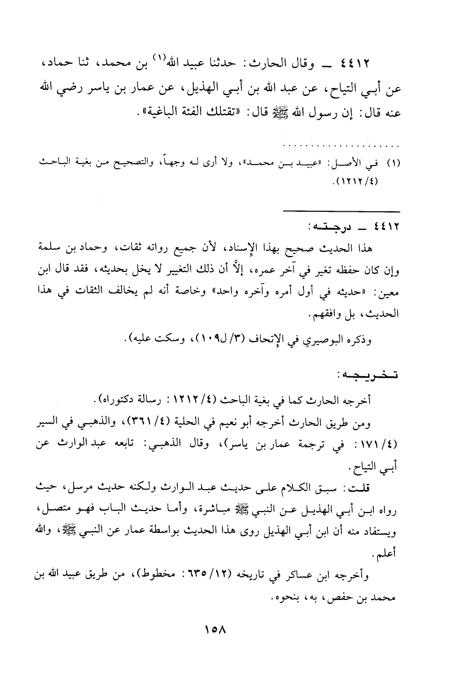 4412 - وَقَالَ الْحَارِثُ: حَدَّثَنَا عُبَيْدُ الله بْنُ مُحَمَّدٍ، ثنا حَمَّادٌ، عَنْ أَبِي التَّيَّاحِ، عَنْ عَبْدِ اللَّهِ بْنِ أَبِي الْهُذَيْلِ، عَنْ عَمَّارِ بْنِ يَاسِرٍ رَضِيَ الله عَنْه قَالَ: إِنَّ رَسُولَ اللَّهِ صَلَّى اللَّهُ عَلَيْهِ وَسَلَّمَ قَالَ: " §تَقْتُلُكَ الْفِئَةُ الْبَاغِيَةُ ".