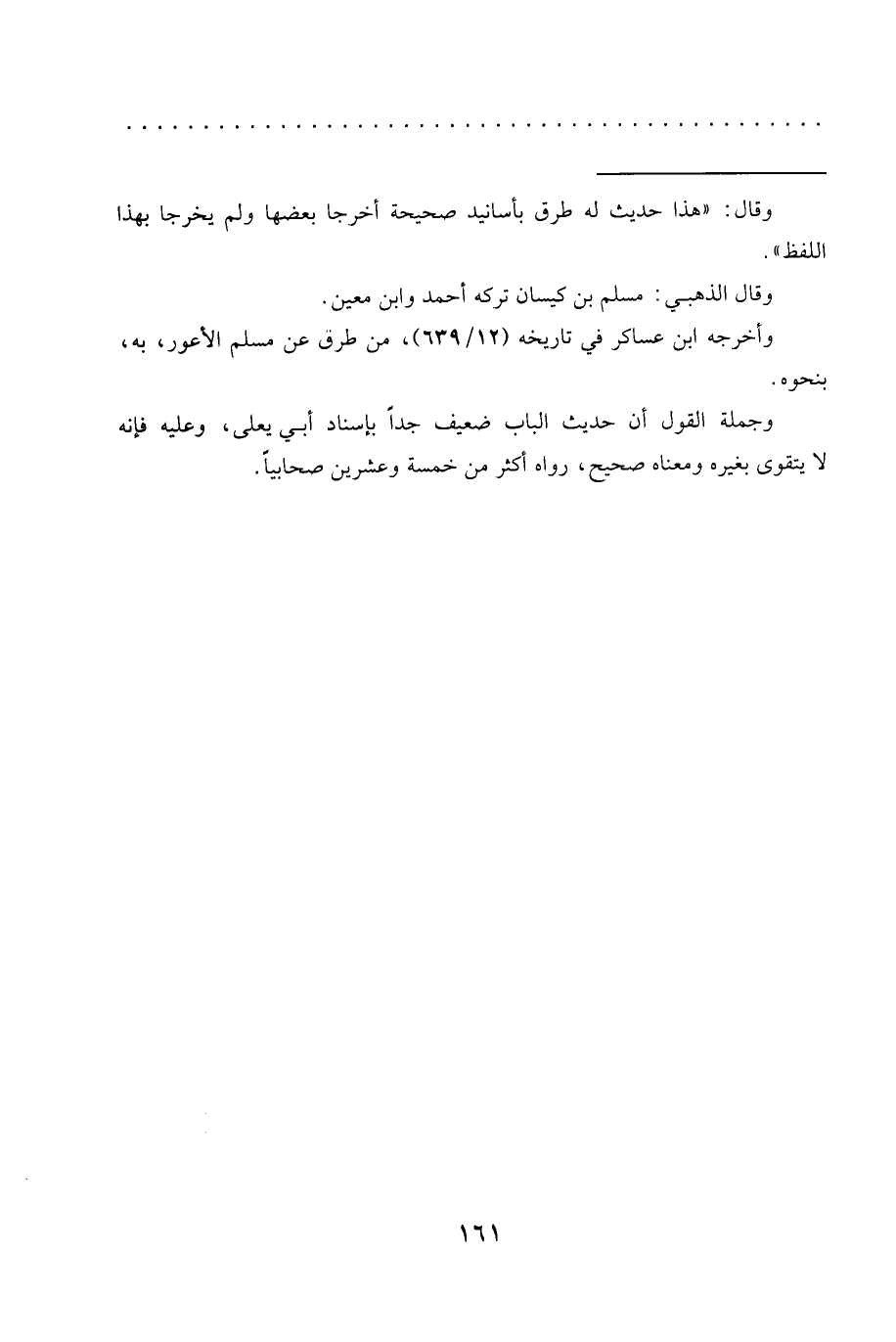 وجملة القول أن حديث الباب ضعيف جدًا بإسناد أبي يعلى، وعليه فإنه لا يتقوى بغيره ومعناه صحيح، رواه أكثر من خمسة وعشرين صحابيًا.