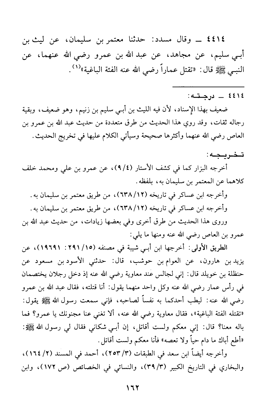 4414 - وَقَالَ مُسَدَّدٌ: حَدَّثَنَا مُعْتَمِرُ بْنُ سُلَيْمَانَ، عَنْ لَيْثِ بْنِ أَبِي سُلَيْمٍ، عَنْ مُجَاهِدٍ، عَنْ عَبْدِ اللَّهِ بن عمرو رَضِيَ الله عَنْهما، عَنِ النَّبِيِّ صَلَّى اللَّهُ عَلَيْهِ وَسَلَّمَ قَالَ: " §تَقْتُلُ عَمَّارًا رَضِيَ الله عَنْه الْفِئَةُ الْبَاغِيَةُ ".