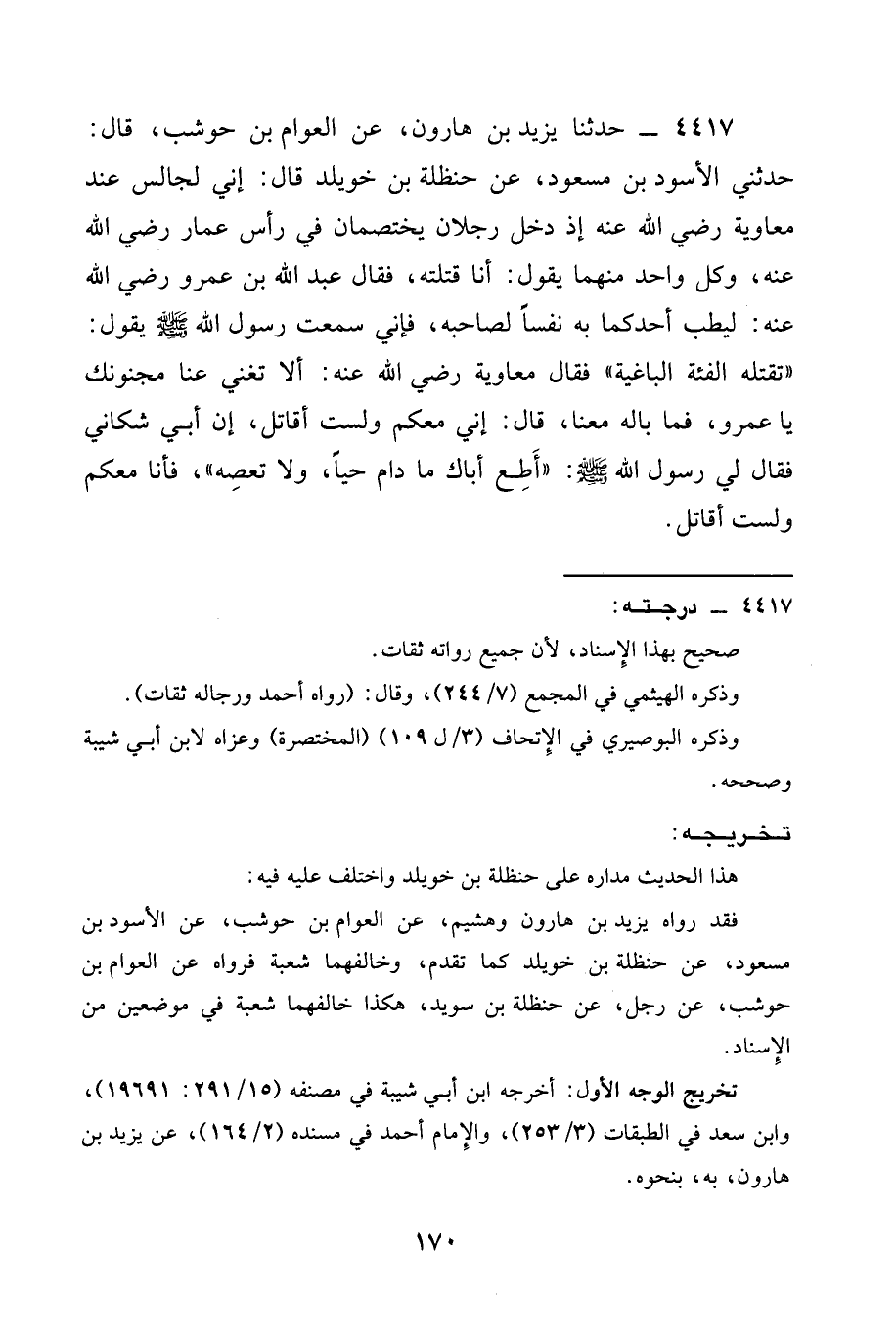 4417 - حَدَّثَنَا يَزِيدُ بْنُ هَارُونَ، عَنِ الْعَوَّامِ بْنِ حَوْشَبٍ، قَالَ: حَدَّثَنِي الْأَسْوَدُ بْنُ مَسْعُودٍ، عَنْ حَنْظَلَةَ بْنِ خُوَيْلِدٍ قَالَ: إِنِّي لَجَالِسٌ عِنْدَ مُعَاوِيَةَ رَضِيَ الله عَنْه إِذْ دَخَلَ رَجُلَانِ يَخْتَصِمَانِ فِي رَأْسِ عَمَّارٍ رَضِيَ الله عَنْه، وَكُلُّ وَاحِدٍ مِنْهُمَا يَقُولُ: أَنَا قَتَلْتُهُ، فَقَالَ عَبْدُ اللَّهِ بْنُ عَمْرٍو رَضِيَ الله عَنْه: لِيَطِبْ أَحَدُكُمَا بِهِ نَفْسًا لِصَاحِبِهِ، فَإِنِّي سَمِعْتُ رَسُولَ اللَّهِ صَلَّى اللَّهُ عَلَيْهِ وَسَلَّمَ يَقُولُ: " §تَقْتُلُهُ الْفِئَةُ الْبَاغِيَةُ " فَقَالَ مُعَاوِيَةُ رَضِيَ الله عَنْه: أَلَا تُغْنِي عَنَّا مَجْنُونَكَ يَا عَمْرُو، فَمَا بَالُهُ مَعَنَا، قَالَ: إِنِّي مَعَكُمْ وَلَسْتُ أُقَاتِلُ، إِنَّ أَبِي شَكَانِي فَقَالَ لِي رَسُولُ اللَّهِ صَلَّى اللَّهُ عَلَيْهِ وَسَلَّمَ: " أَطِعْ أَبَاكَ مَا دَامَ حَيًّا، وَلَا تَعْصِهِ "، فَأَنَا مَعَكُمْ وَلَسْتُ أُقَاتِلُ.