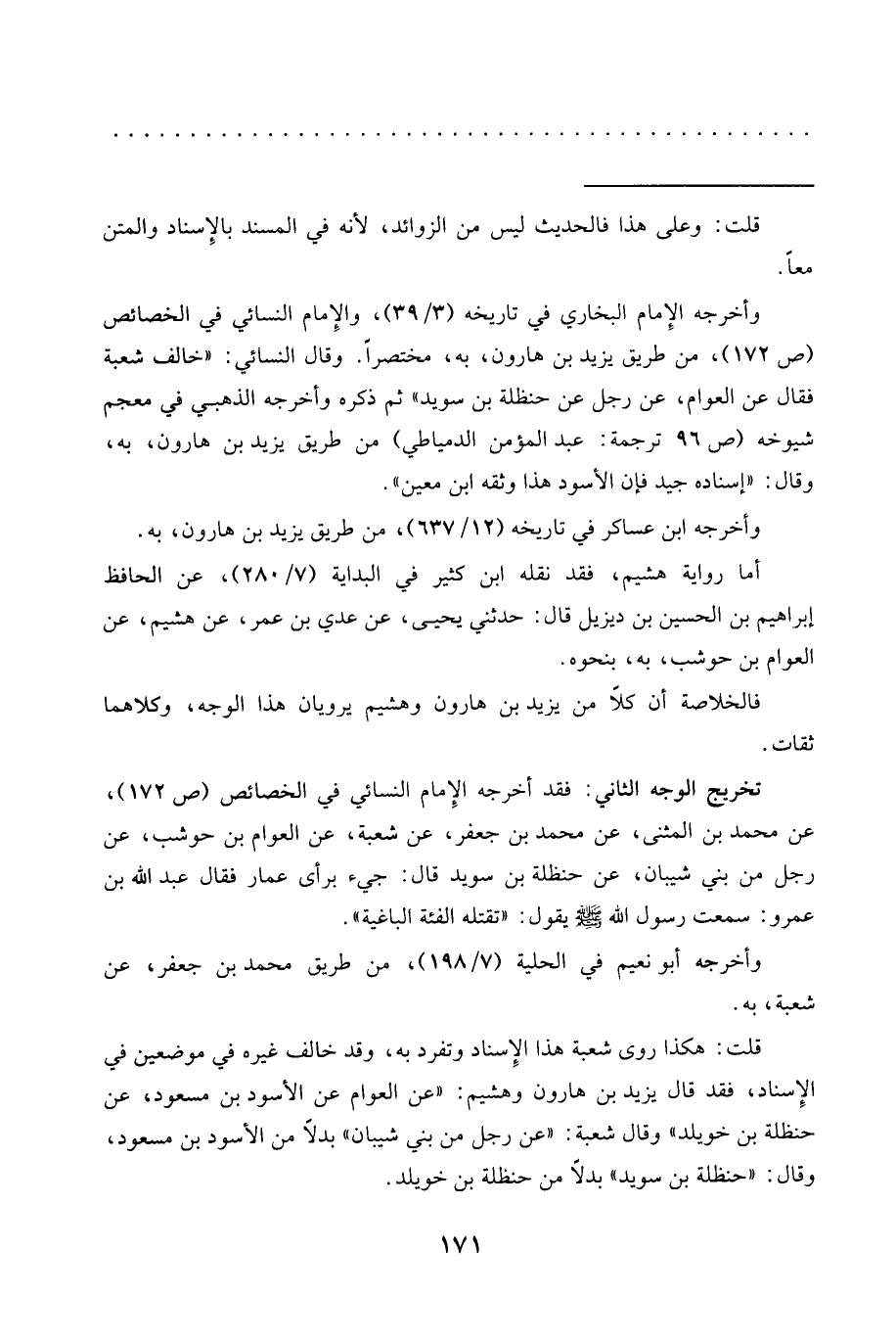 تخريج الوجه الثاني: فقد أخرجه الإِمام النسائي في الخصائص (ص 172)، عن محمَّد بن المثنى، عن محمَّد بن جعفر، عن شعبة، عن العوام بن حوشب، عن رجل من بني شيبان، عن حنظلة بن سويد قال: جيء برأى عمار فَقَالَ عَبْدُ اللَّهِ بْنُ عَمْرٌو: سَمِعْتُ رَسُولَ اللَّهِ -صَلَّى اللَّهُ عَلَيْهِ وَسَلَّمَ- يَقُولُ: "تَقْتُلُهُ الفئة الباغية".