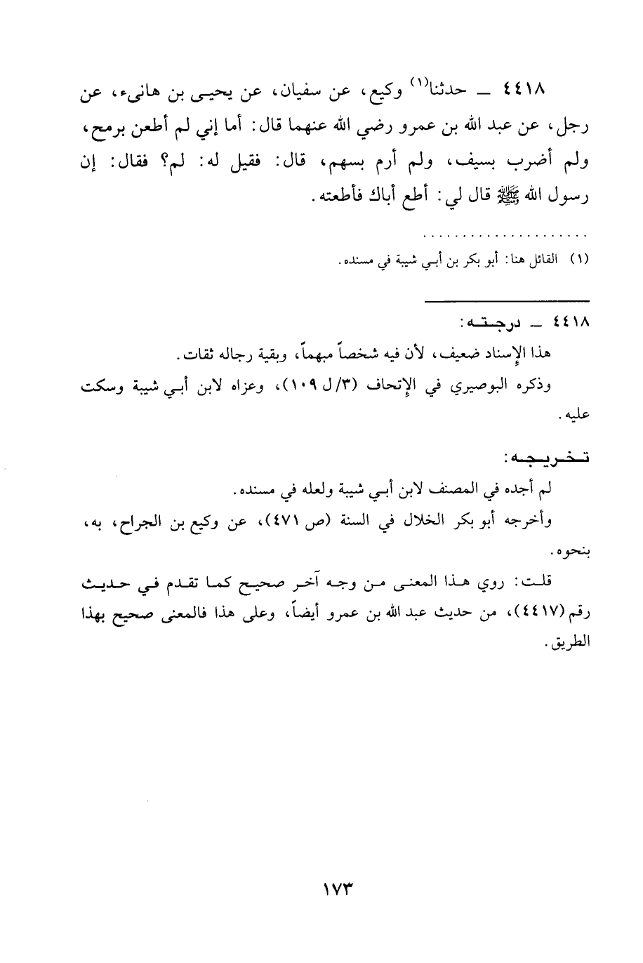 4418 - حَدَّثَنَا وَكِيعٌ، عَنْ سُفْيَانَ، عَنْ يَحْيَى بْنِ هَانِئٍ، عَنْ رَجُلٍ، عَنْ عَبْدِ اللَّهِ بن عمرو رَضِيَ الله عَنْهما قَالَ: أَمَا إِنِّي لَمْ أَطْعَنْ بِرُمْحٍ، وَلَمْ أَضْرِبْ بِسَيْفٍ، وَلَمْ أَرْمِ بِسَهْمٍ، قَالَ: فَقِيلَ لَهُ: لِمَ؟ فَقَالَ: إِنَّ رَسُولَ اللَّهِ صَلَّى اللَّهُ عَلَيْهِ وَسَلَّمَ قَالَ لِي: §أَطِعْ أَبَاكَ فَأَطَعْتُهُ