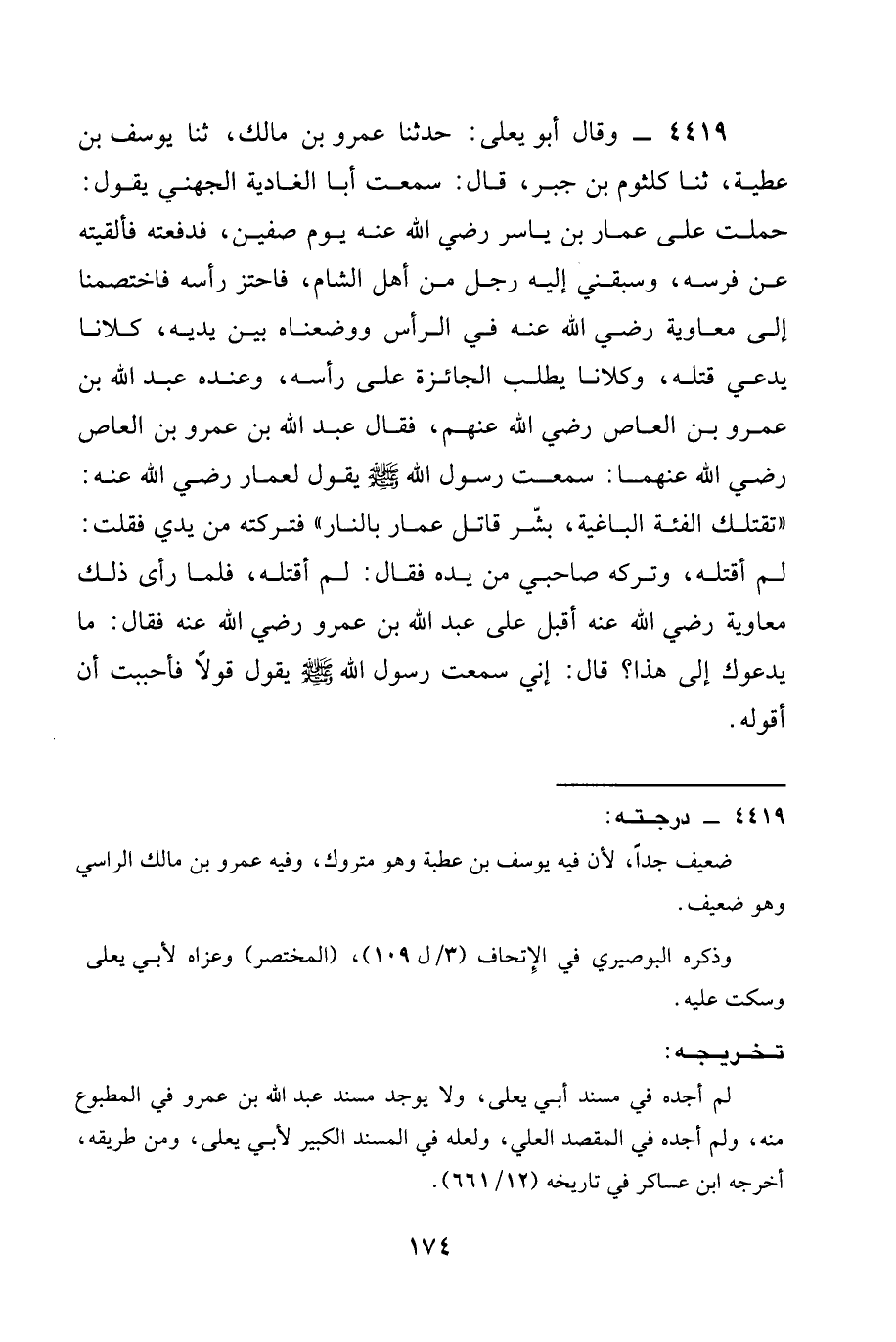 4419 - وَقَالَ أَبُو يَعْلَى: حَدَّثَنَا عَمْرُو بْنُ مَالِكٍ، ثنا يُوسُفُ بْنُ عَطِيَّةَ، ثنا كُلْثُومُ بْنُ جَبْرٍ، قَالَ: سَمِعْتُ أَبَا الْغَادِيَةِ الْجُهَنِيِّ يَقُولُ: حَمَلْتُ عَلَى عَمَّارِ بْنِ يَاسِرٍ رَضِيَ الله عَنْه يَوْمَ صِفِّينَ، فَدَفَعْتُهُ فَأَلْقَيْتُهُ عَنْ فَرَسِهِ، وَسَبَقَنِي إِلَيْهِ رَجُلٌ مِنْ أهل الشام، فاحتز رَأْسَهُ فَاخْتَصَمْنَا إِلَى مُعَاوِيَةَ رَضِيَ الله عَنْه فِي الرَّأْسِ وَوَضَعْنَاهُ بَيْنَ يَدَيْهِ، كِلَانَا يَدَّعِي قَتْلَهُ، وَكِلَانَا يَطْلُبُ الْجَائِزَةَ عَلَى رَأْسِهِ، وَعِنْدَهُ عَبْدُ اللَّهِ بْنُ عَمْرِو بن العاص رَضِيَ الله عَنْهم، فَقَالَ عَبْدُ اللَّهِ بن عمرو بن العاص رَضِيَ الله عَنْهما: سَمِعْتُ رَسُولَ اللَّهِ صَلَّى اللَّهُ عَلَيْهِ وَسَلَّمَ يَقُولُ لِعَمَّارٍ رَضِيَ الله عَنْه: " §تَقْتُلُكَ الْفِئَةُ الْبَاغِيَةُ، بَشِّرْ قَاتِلَ عَمَّارٍ بِالنَّارِ " فَتَرَكْتُهُ مِنْ يَدَيَّ فَقُلْتُ: لَمْ أَقْتُلْهُ، وَتَرَكَهُ صَاحِبِي مِنْ يَدِهِ فَقَالَ: لَمْ أَقْتُلْهُ، فَلَمَّا رَأَى ذَلِكَ مُعَاوِيَةُ رَضِيَ الله عَنْه أَقْبَلَ عَلَى عَبْدِ اللَّهِ بْنِ عَمْرٍو رَضِيَ الله عَنْه فَقَالَ: مَا يَدْعُوكَ إِلَى هَذَا؟ قَالَ: إِنِّي سَمِعْتُ رَسُولَ اللَّهِ صَلَّى اللَّهُ عَلَيْهِ وَسَلَّمَ يَقُولُ قَوْلًا فَأَحْبَبْتُ أَنْ أَقُولَهُ.