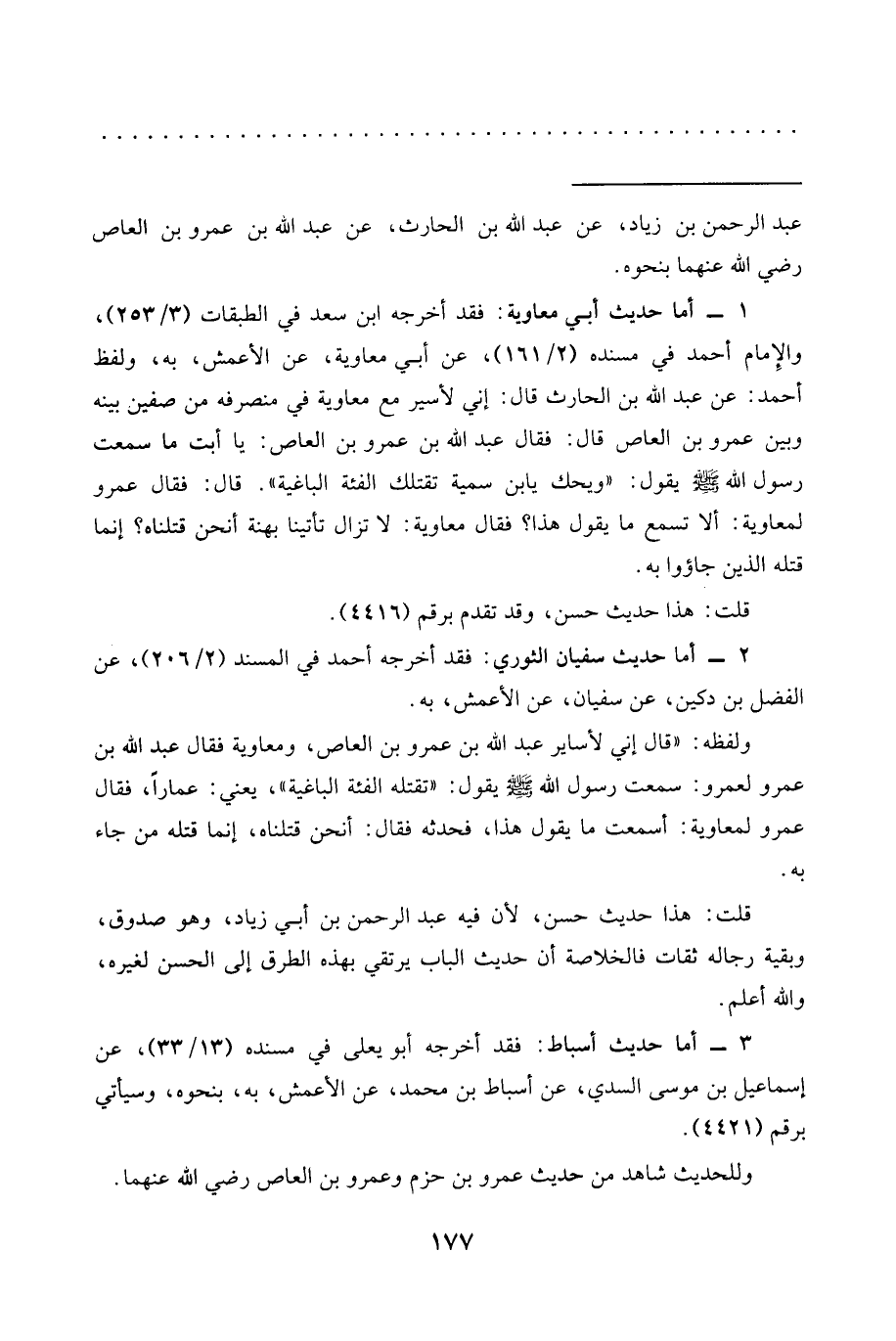 1 - أما حديث أبي معاوية: فقد أخرجه ابن سعد في الطبقات (3/ 253)، والإِمام أحمد في مسنده (2/ 161)، عن أبي معاوية، عن الأعمش، به، ولفظ أحمد: عَنْ عَبْدِ اللَّهِ بْنِ الْحَارِثِ قَالَ: إِنِّي لأسير مع معاوية في مُنْصَرَفَهُ مِنْ صِفِّينَ بَيْنَهُ وَبَيْنَ عَمْرِو بْنِ العاص قال: فقال عبد الله بن عمرو بن العاص: يا أبت ما سمعت رسول الله -صلى الله عليه وسلم- يقول: "ويحك يابن سمية تقتلك الفئة الباغية". قال: فقال عمرو لمعاوية: ألا تسمع ما يقول هذا؟ فقال معاوية: لا تزال تأتينا بهنة أنحن قتلناه؟ إنما قتله الذين جاؤوا به.